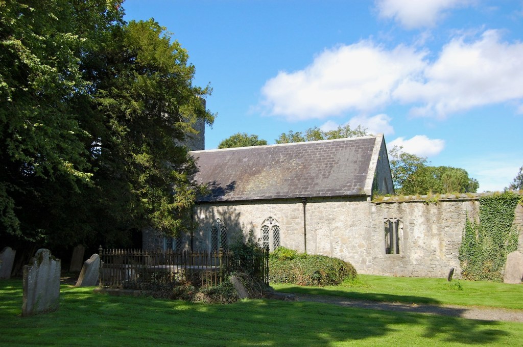“Detached single-cell church, c.1775, incorporating west tower and chancel of fifteenth-century church. Four-bay nave, with further three bays to east, now unroofed. Rubble stone walls. Paired cusp-headed windows with quatrefoil [2] over having smooth limestone surround to nave. Large pointed-arched window with flowing tracery to the east gable of nave. Pitched slate roof. Graveyard to grounds in use since medieval times. Some table graves, legible gravestones dating from the late 1760s, also including medieval cross. Rendered stone rubble boundary wall and gate piers to road.