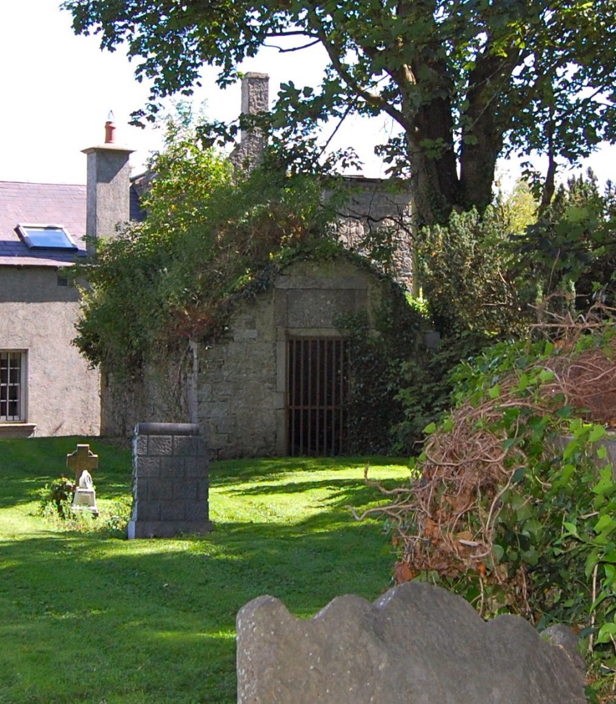 There is a large vault, grass-grown at top, with a cross-shaped loophole at east end,inscribed:-