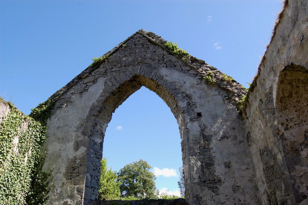 I visited this property in 2012 during Heritage Week with my husband Stephen and my Dad. We were welcomed by the owner, Frank Kerins. A glebe house is one on the grounds of a church providing accommodation for the clergy. This house is next to Saint Finian’s, an ancient church from the fifteenth century, but no longer houses its vicar and is in private ownership. St. Finian’s is now a Church of Ireland and still holds weekly services. There’s a beautiful view of the church from the back of the house, where one can see the restored Gothic “pointed-arched window with flowing tracery” [1] through another arch, and behind, the church tower.
