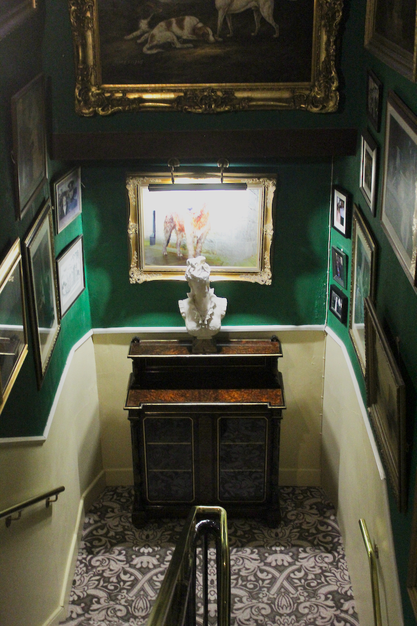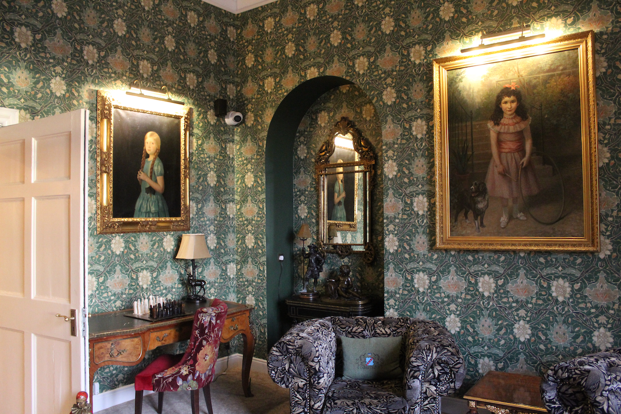 On the second floor is more cosy sitting room, decorated in dark green William Morris style wallpaper, making it more like a den or library.