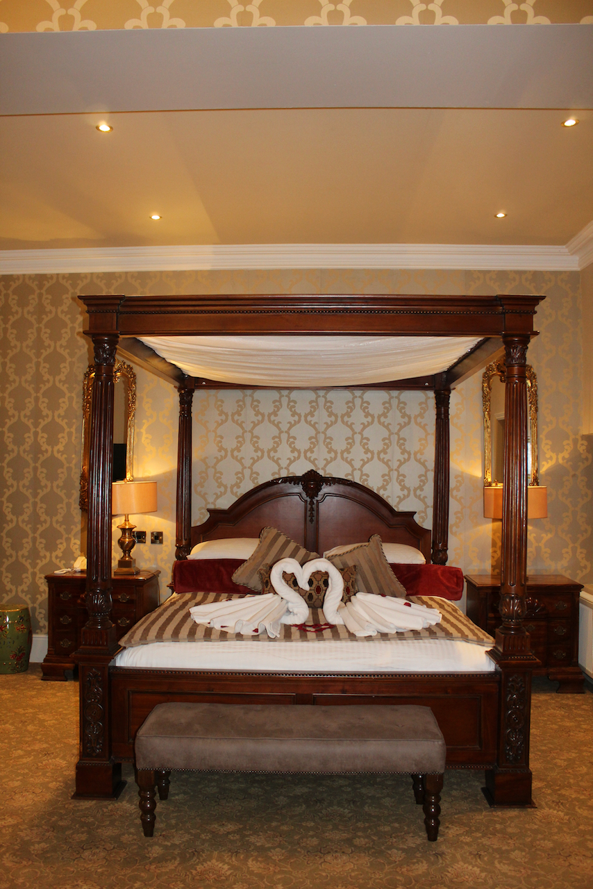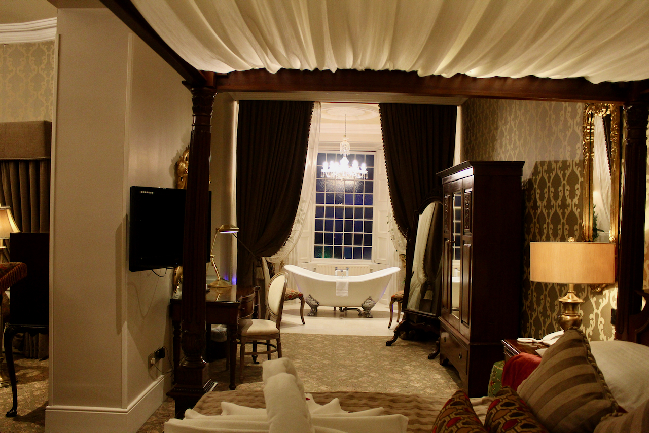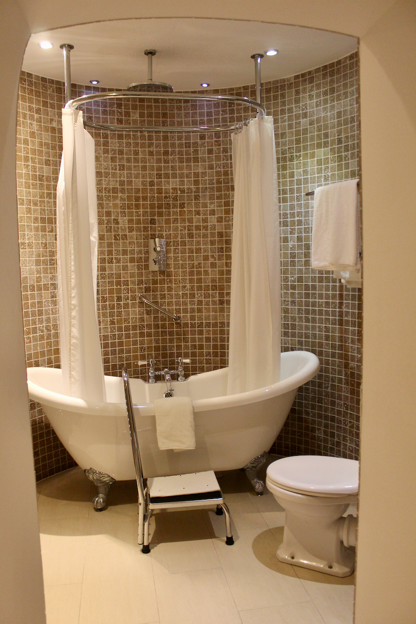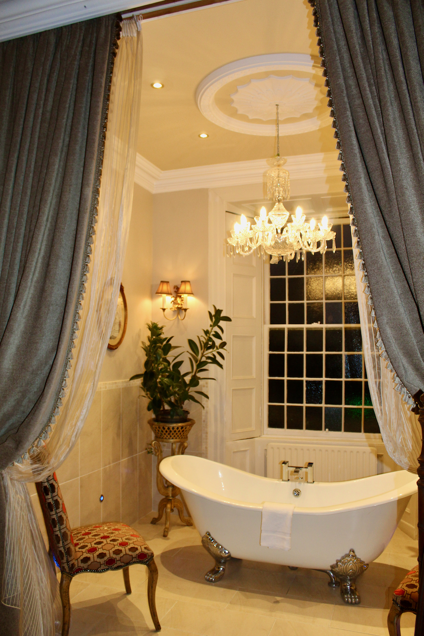 There is another Bridal Suite, inside the castle. I have saved the best until last, because this was our room! It used to be three bedrooms, a hallway and an office, all now incorporated into a luxurious suite. It has a canopied four poster bed, a comfortable seating area with fireplace, and a beautiful clawfoot bath.
