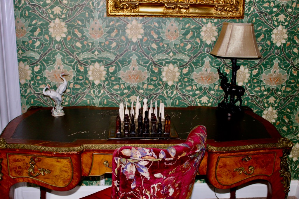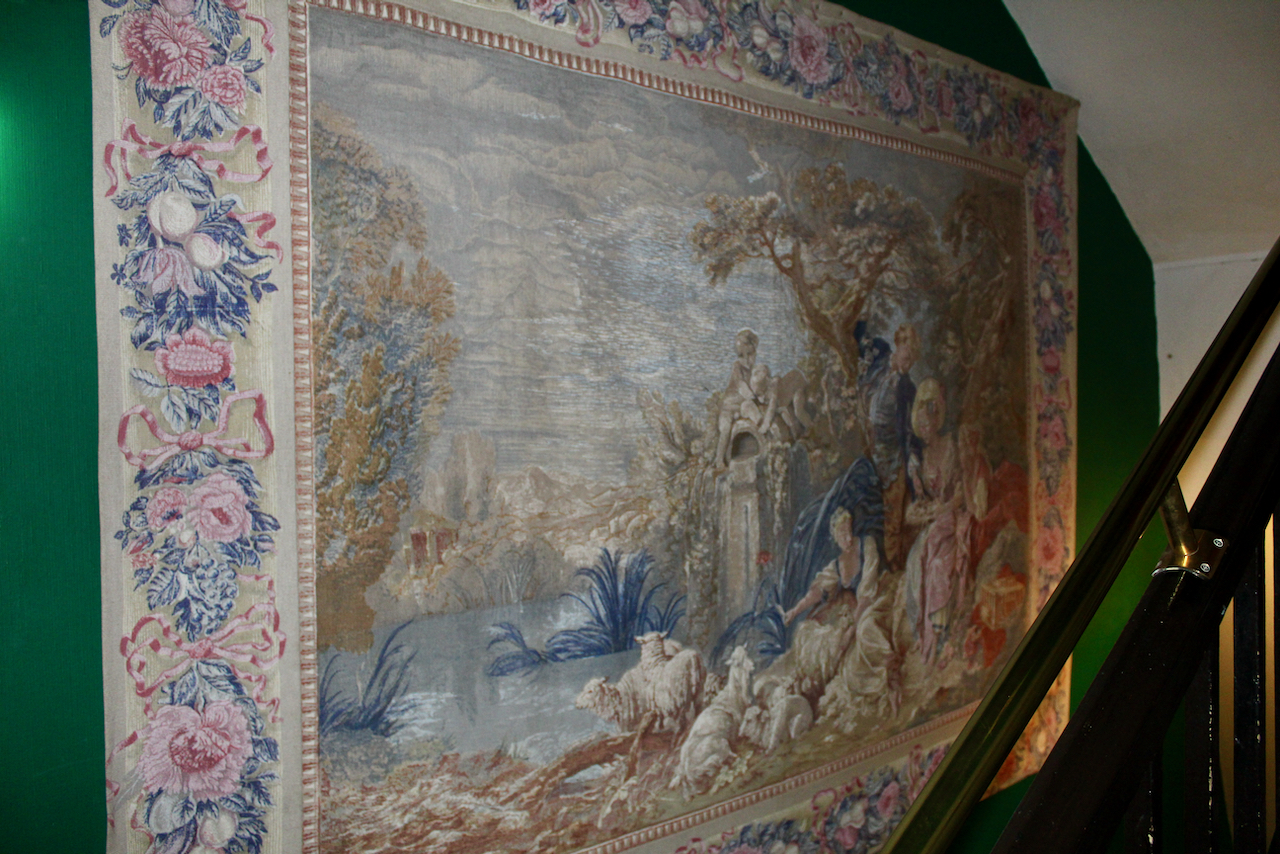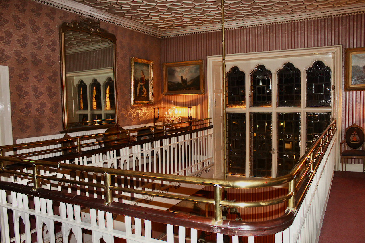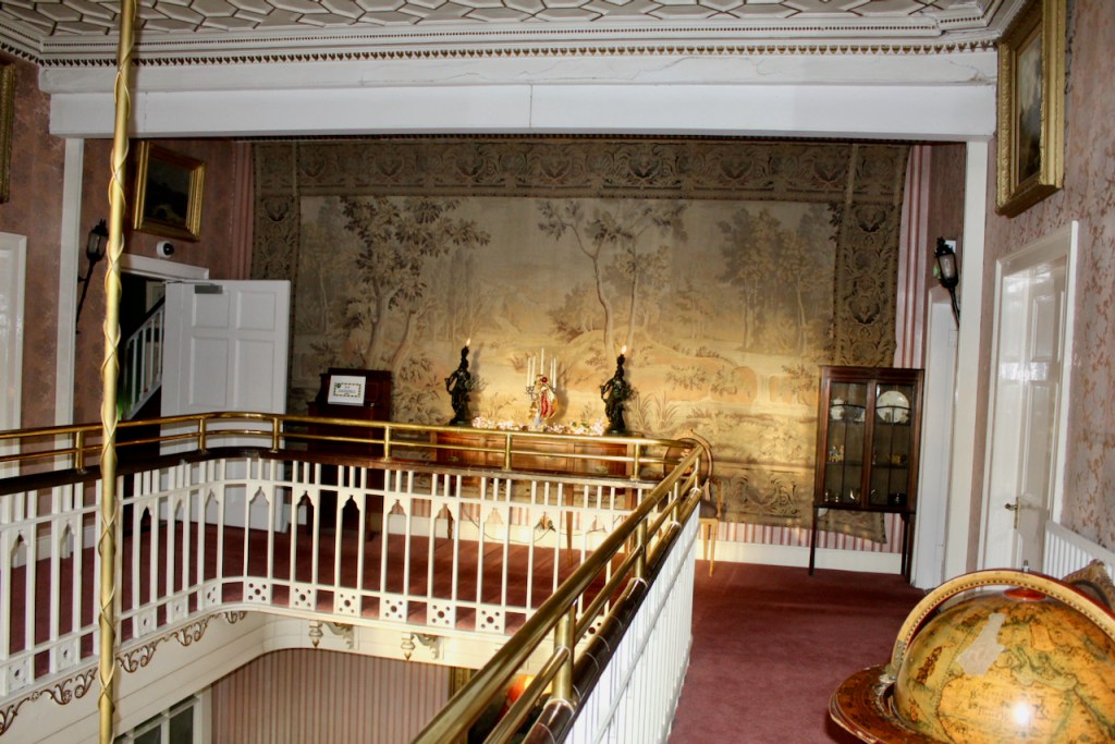 At the top of the stairs on the first floor is a Victorian drawing room with an original gilt wallpaper.