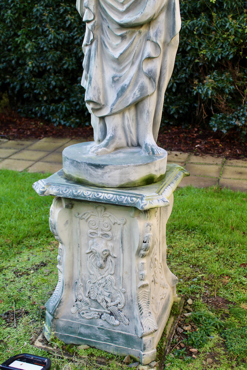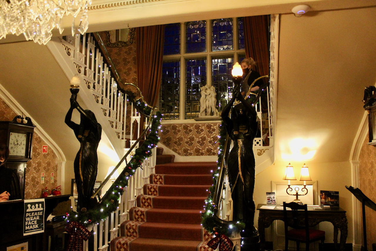 Beyond the reception area is the staircase hall with a bifurcating staircase with metalwork balustrade ascending to the first floor. Two statues very similar to the ones that were recently removed from outside the Shelbourne Hotel in Dublin while the owners determined whether they represented slave girls or not (they do not) adorn the staircase. [17]