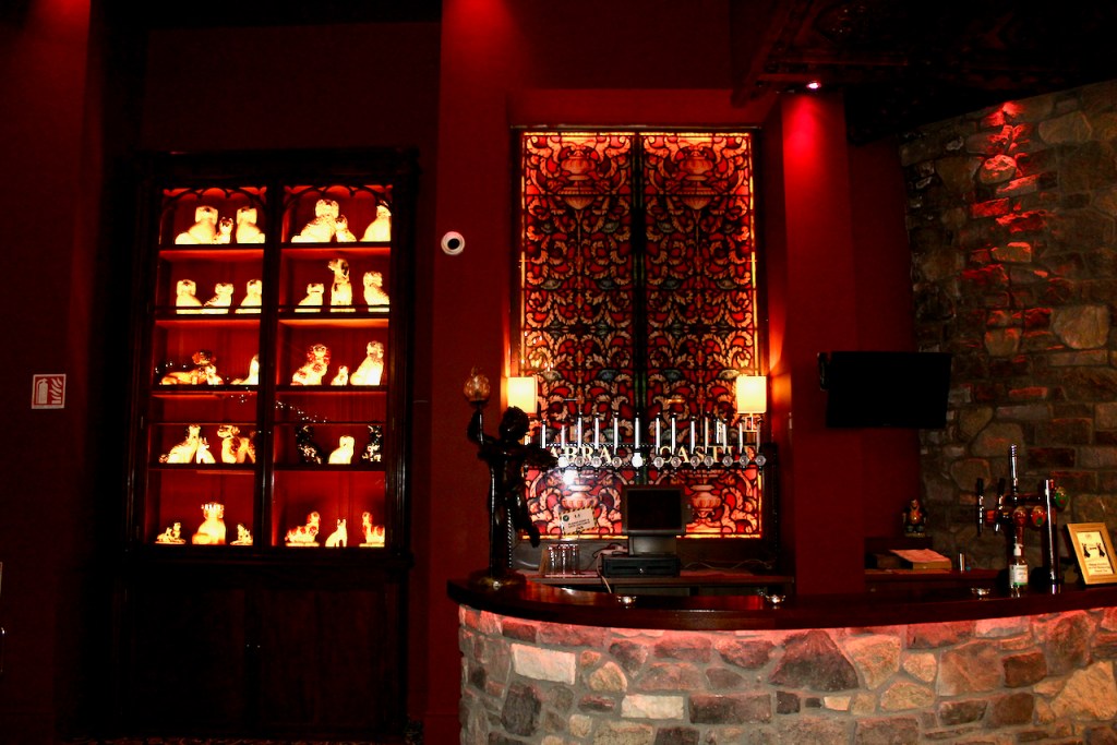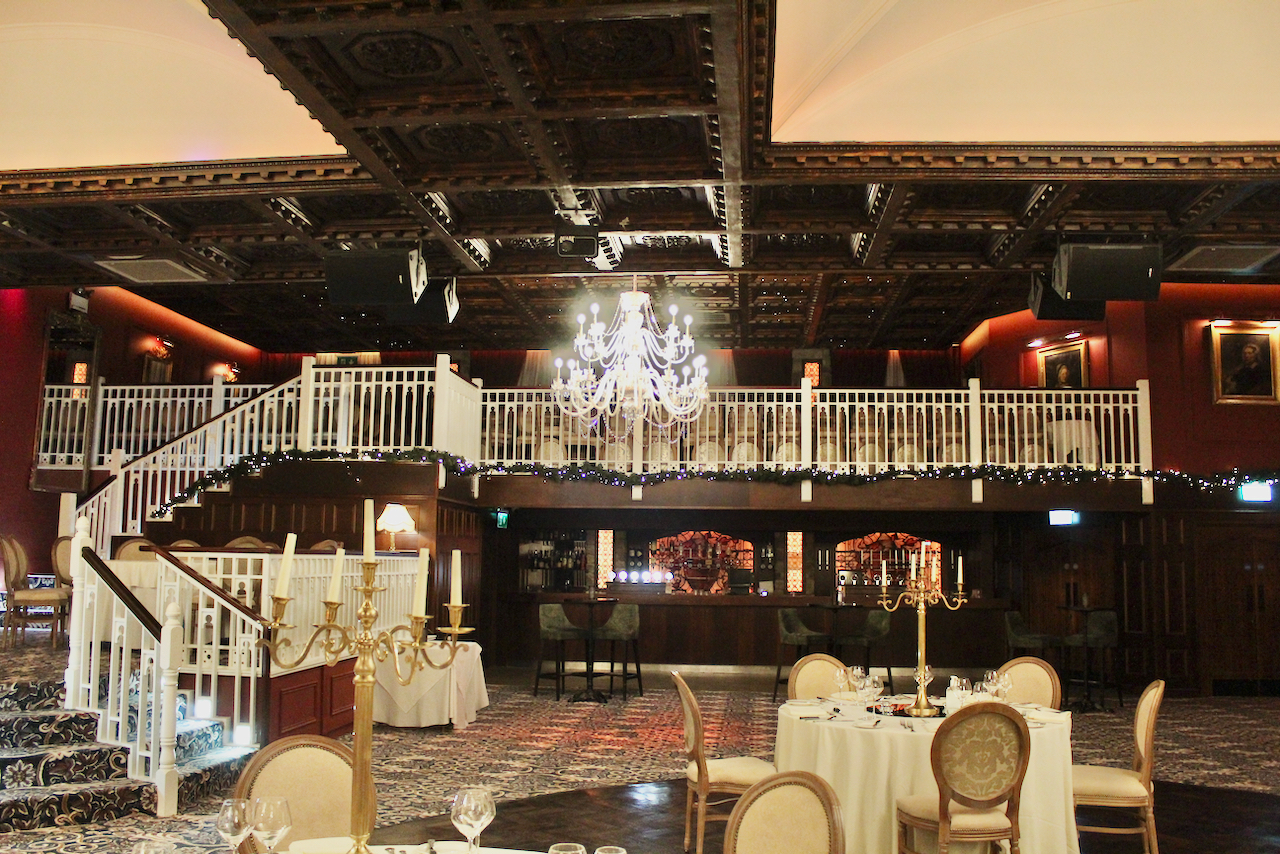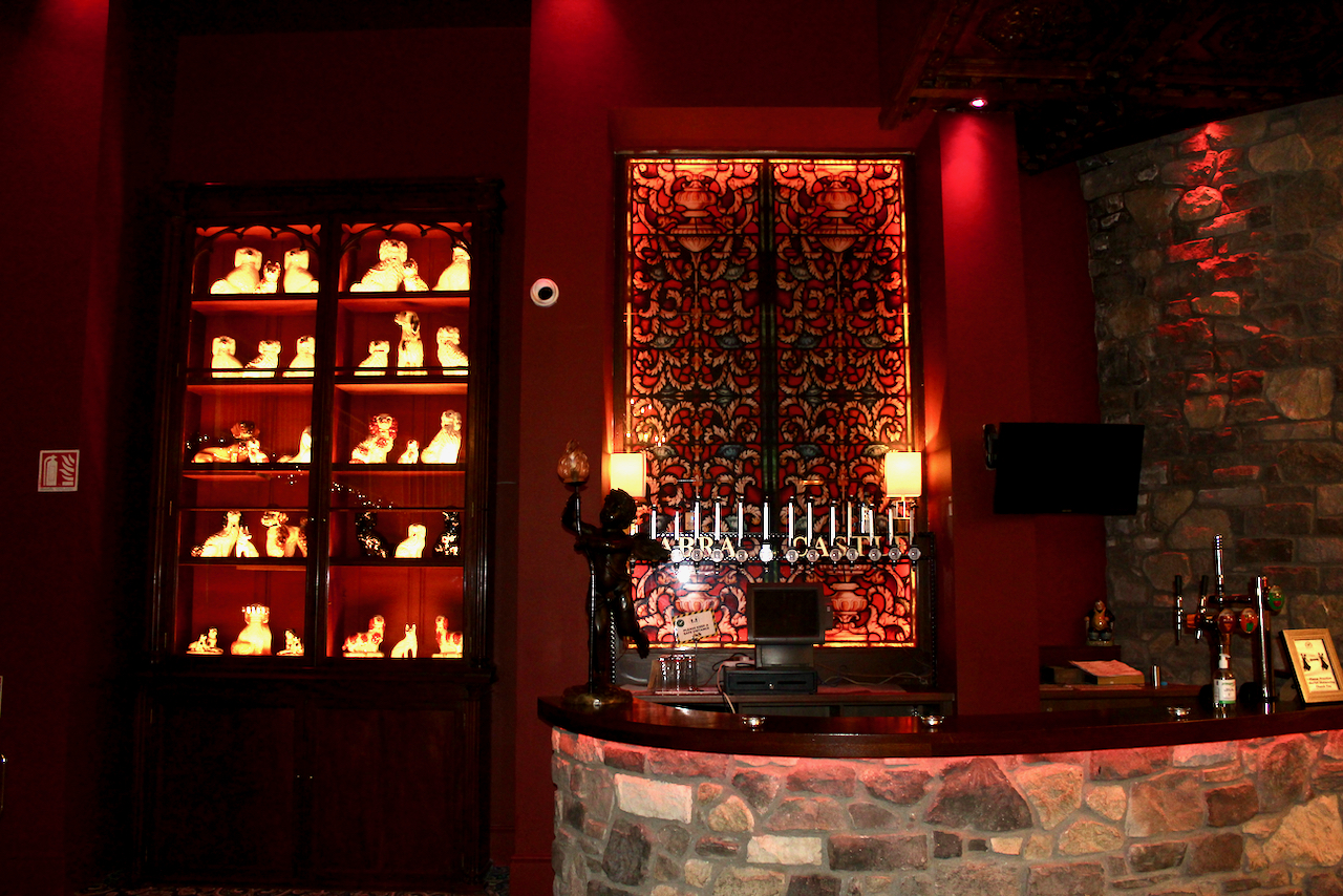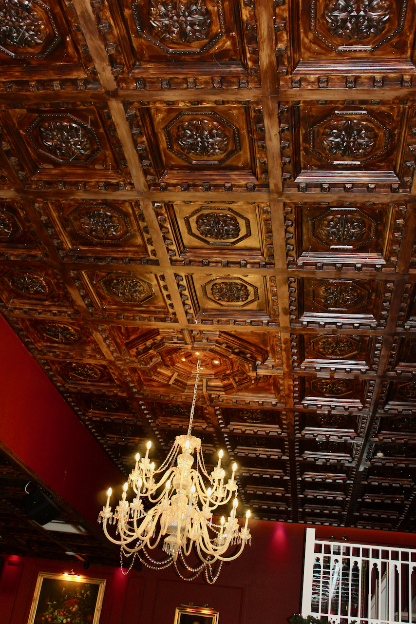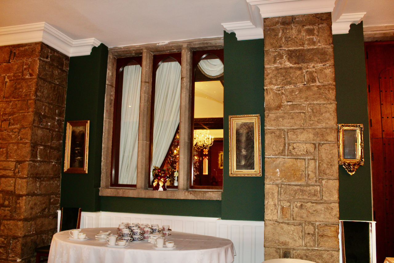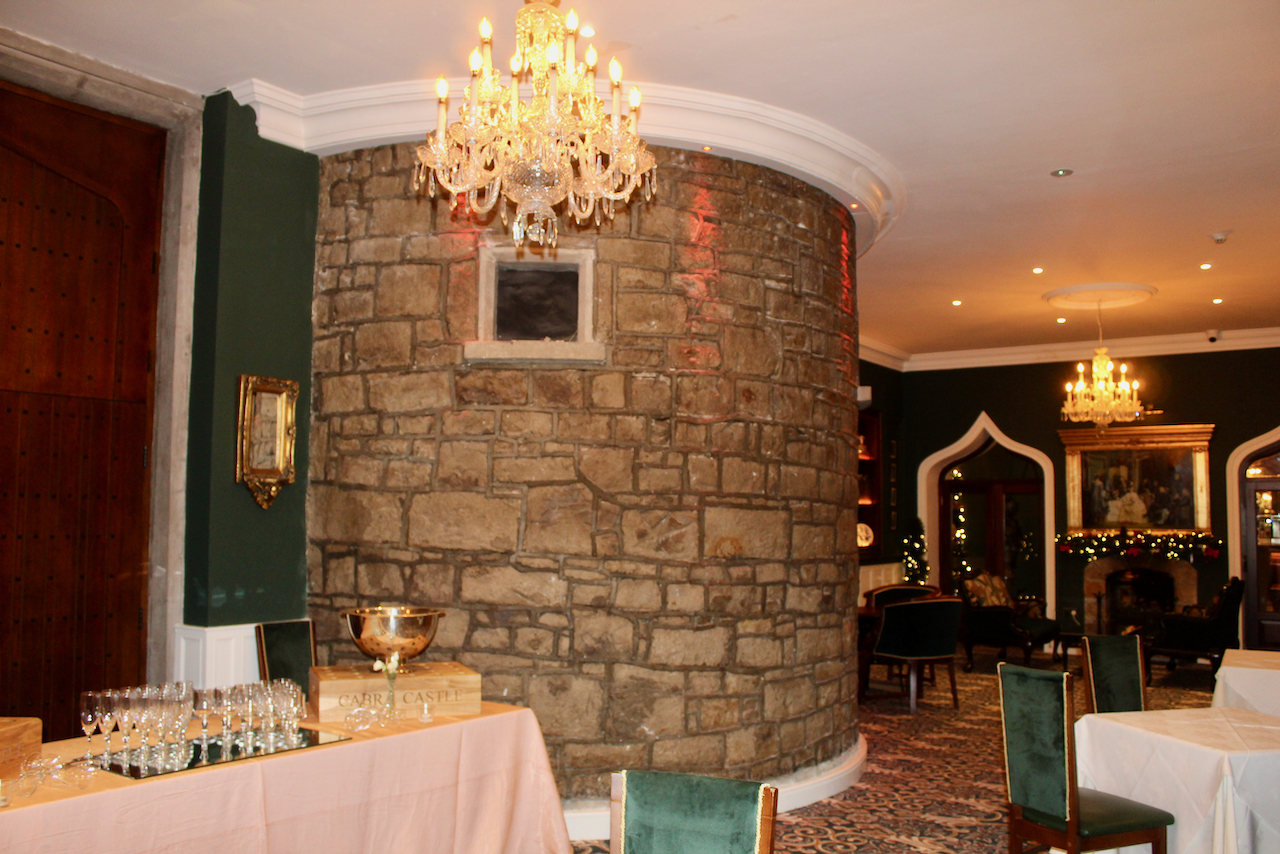 The manager then took us through to the most recent piece de resistance, the Ballroom. It has been sensitively built and decorated to reflect the style of the older parts of the castle, and I loved the ceiling, which is quite amazing and looks like heavy medieval carved wood but is actually manufactured using a modern technique. In the hallway leading to the ballroom, our guide pointed out that the original round stone tower of the castle has been incorporated.