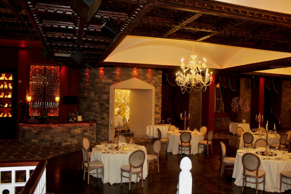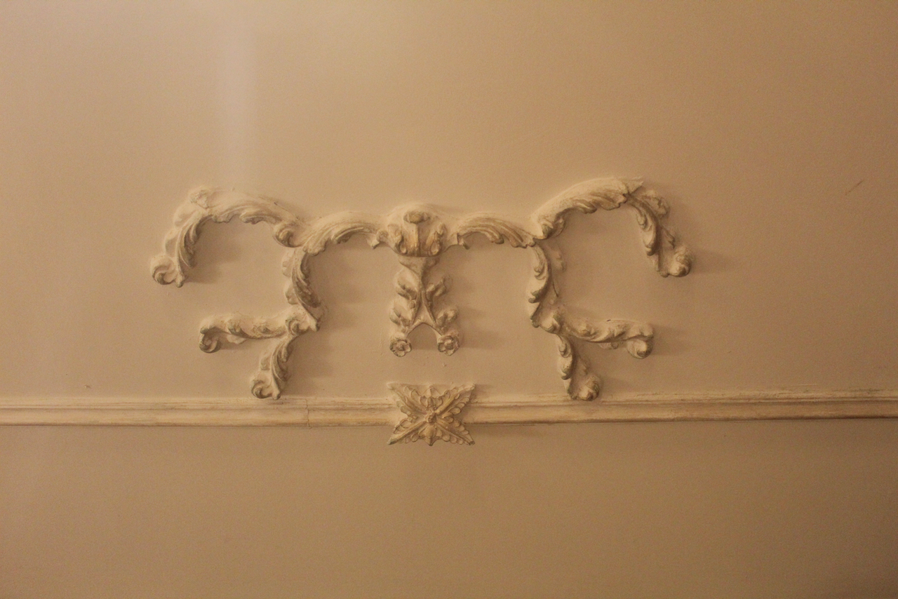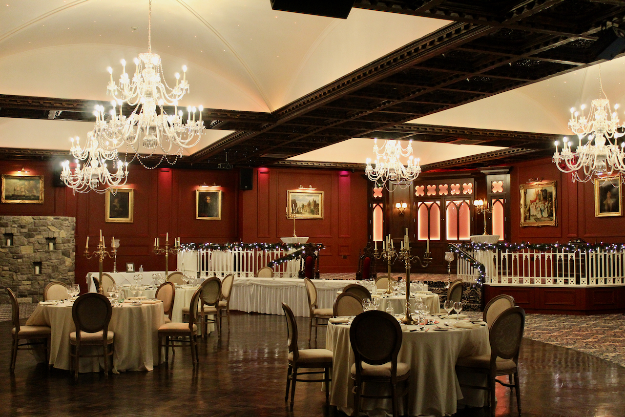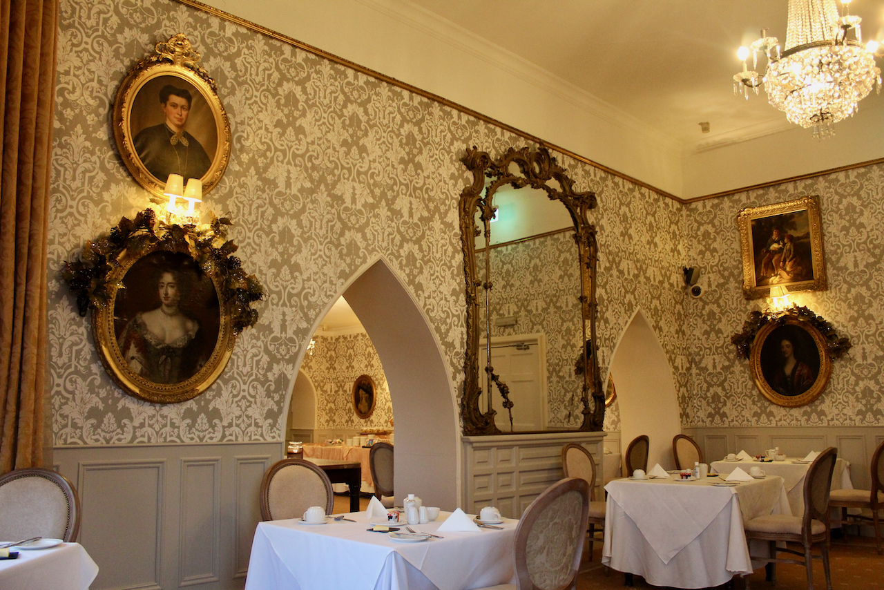 The ceiling has matching gilt decoration. Next to this room, facing the staircase, is the dining area – a suite of several rooms. The arches between the rooms reflect the entrance arch to the castle and the arched windows.