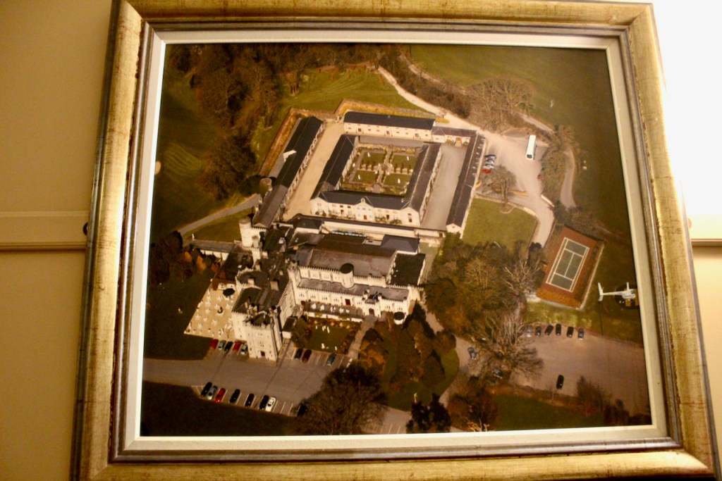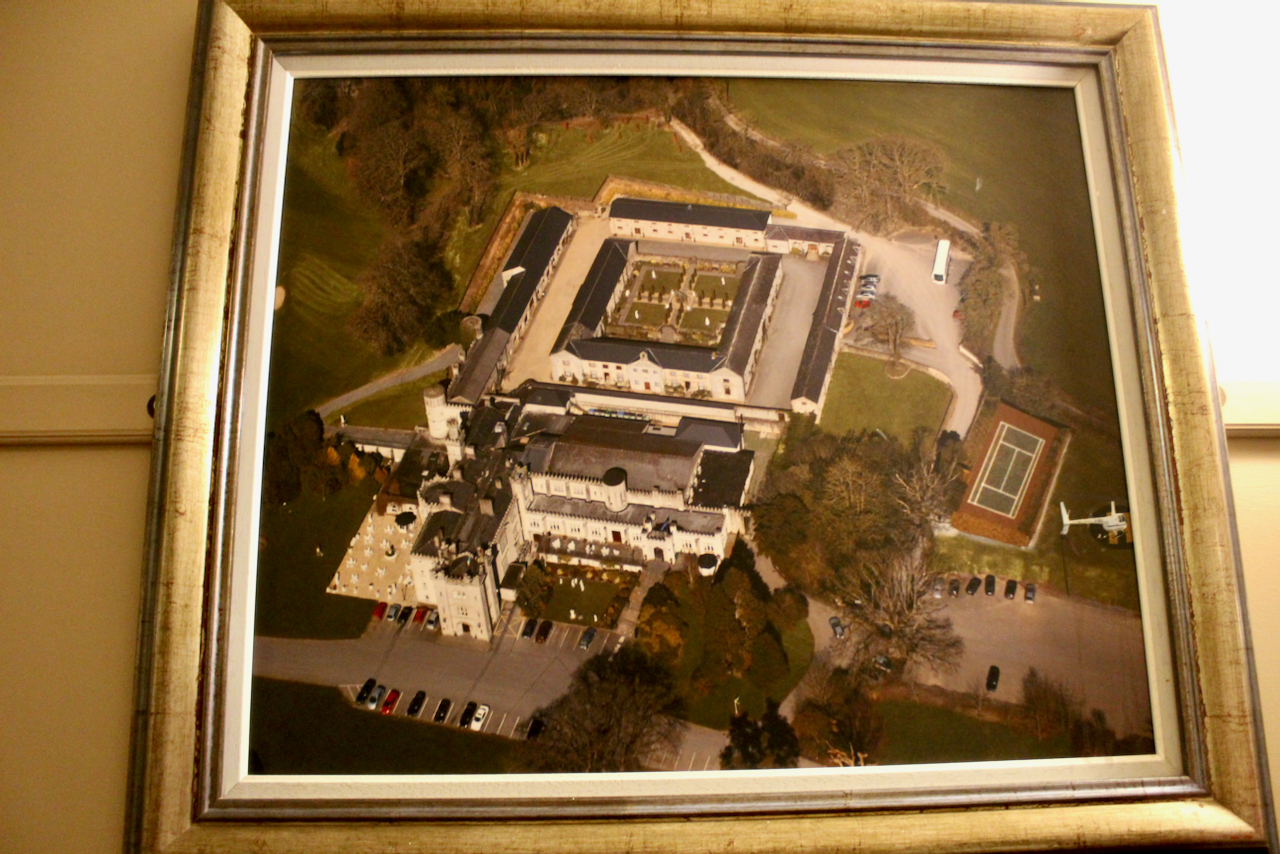 The oldest part of the castle can be pinpointed in the aerial view. According to the National Inventory of Architectural Heritage the “earlier house of c.1750 [is] embedded within northern section of south-east side concealed behind extension of c.1990, junction marked by square-plan rendered turret corresponding to north-west side in simplified form.” This square plan turret actually contains our bathroom!