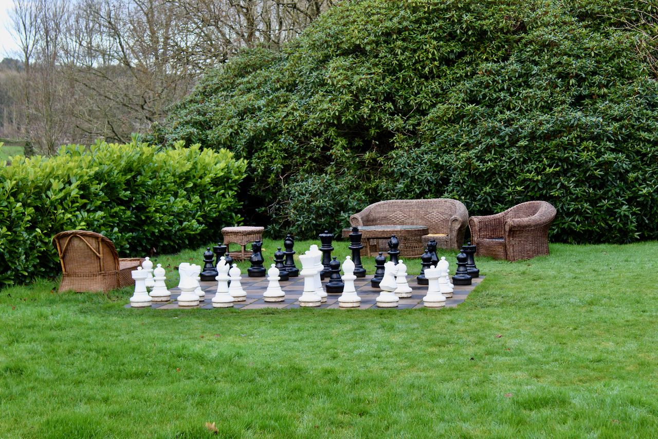 This courtyard looks out to a lawn area that has a giant chess set and places to sit.