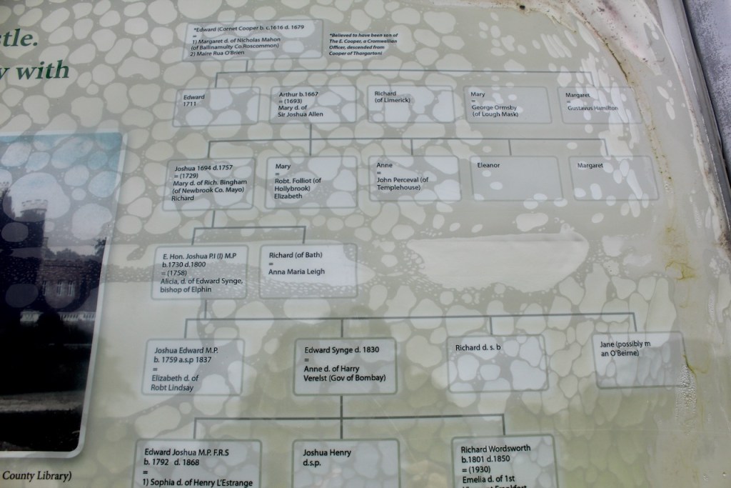 It was Arthur’s great-great-grandson Joshua Edward Cooper (about 1759-1837) who built the castle in 1802 around an earlier structure. Arthur’s son Joshua (1694-1757) married Mary Bingham from Newbrook, County Mayo. His son, another Joshua (1730-1800), was MP for County Sligo and opposed the Act of Union, which abolished the Irish Parliament, so that Ireland was run by the Parliament in London. He married Alicia Synge, daughter and heiress of Edward Synge, Bishop of Elphin, and she brought him a large fortune. [6]