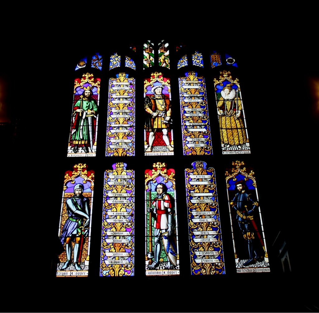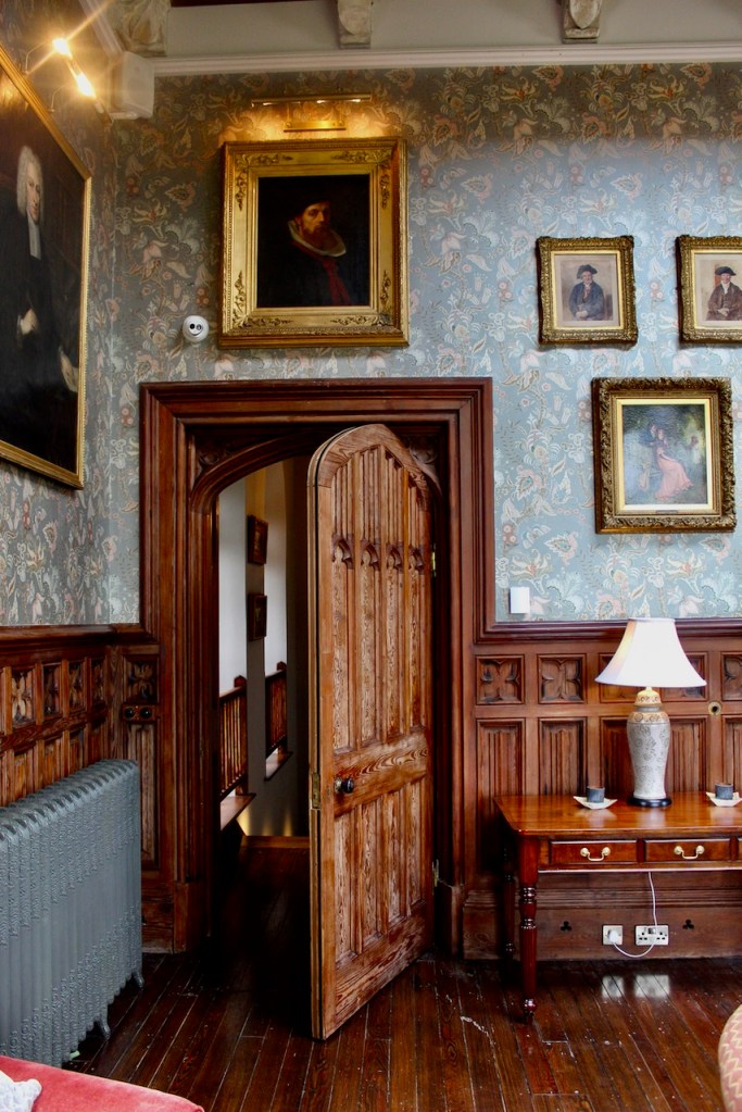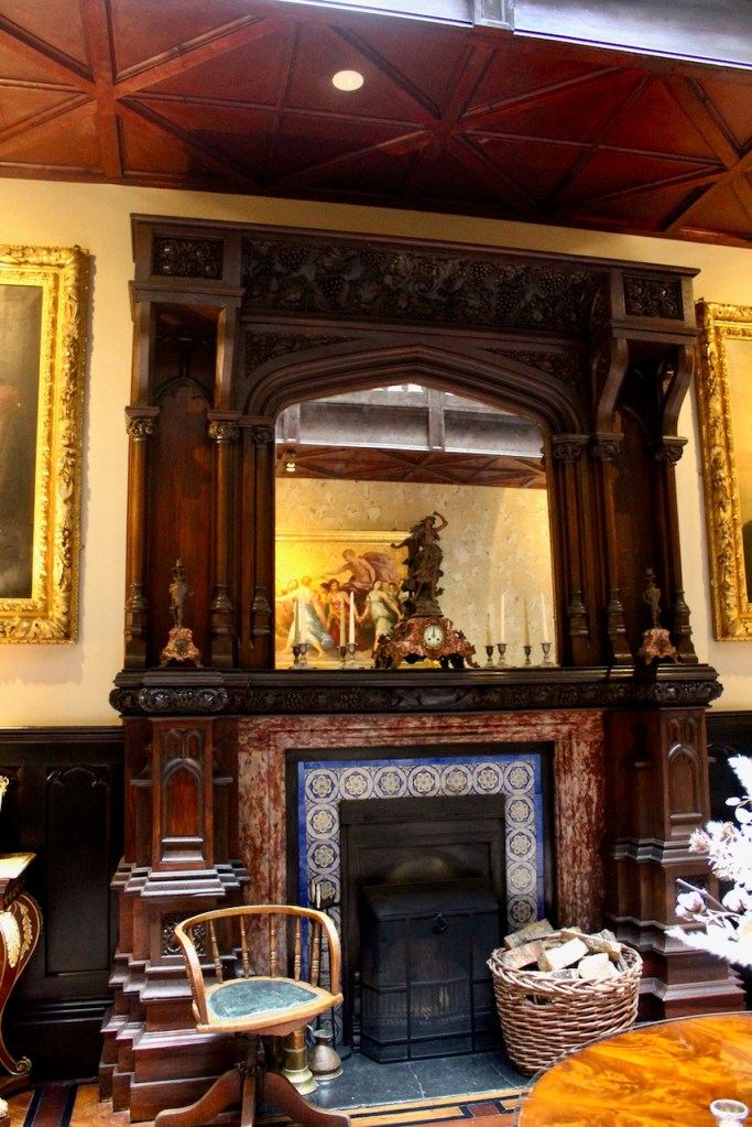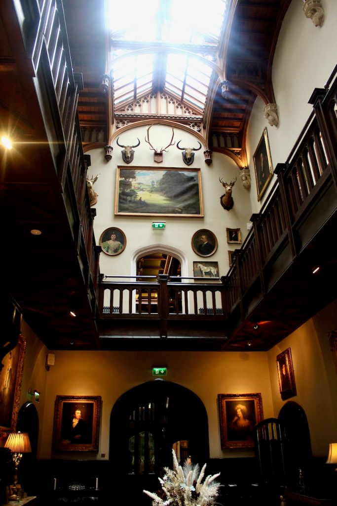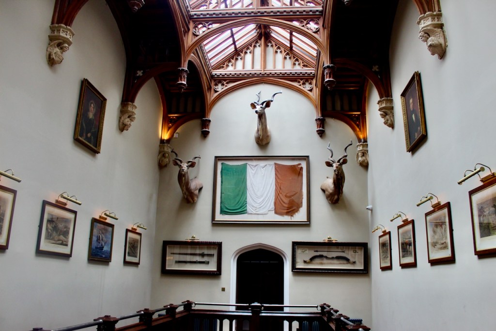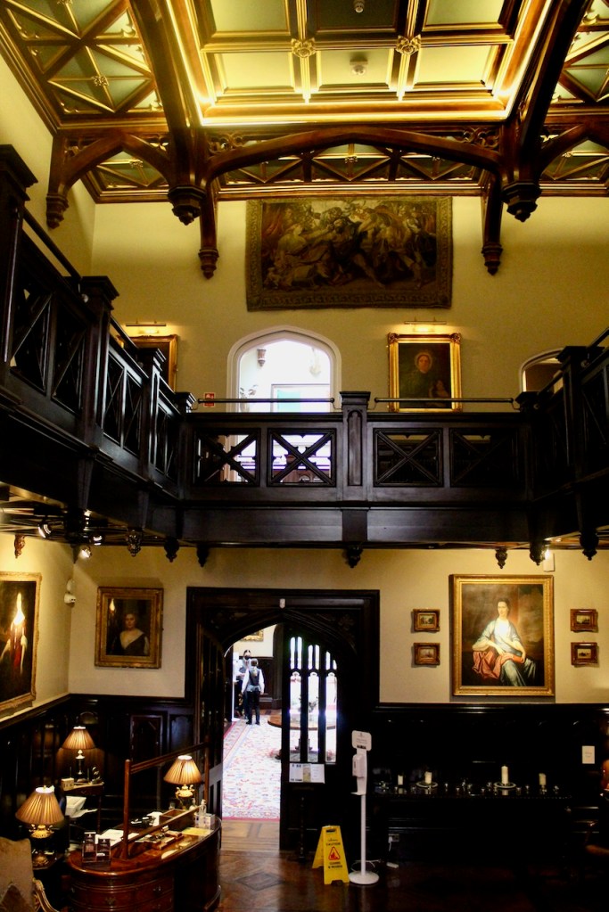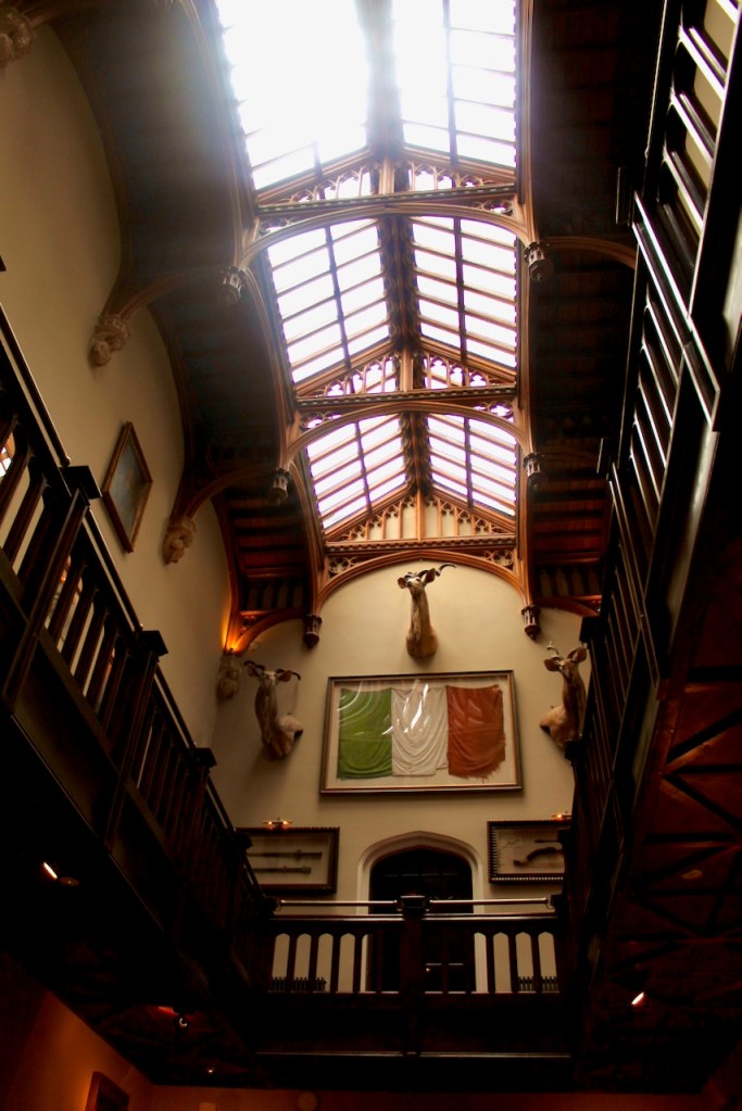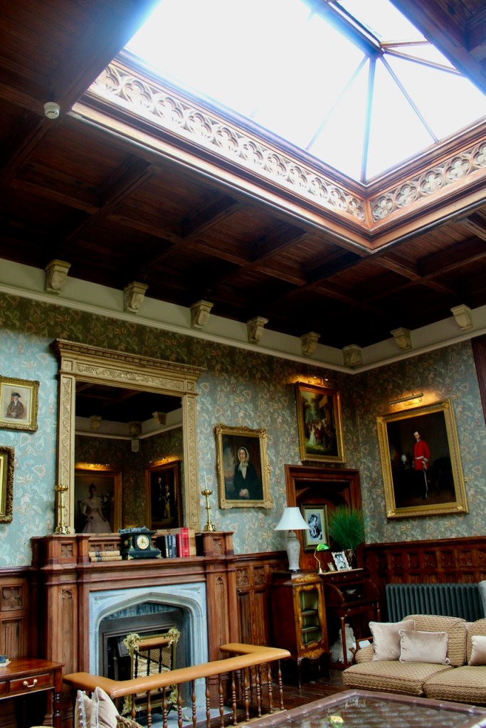 The reception hall is surrounded by a carved wooden gallery and contains a Victorian double staircase of oak, lit by a heraldic stained glass window illustrating the family tree with portraits of ancestors and monarchs.