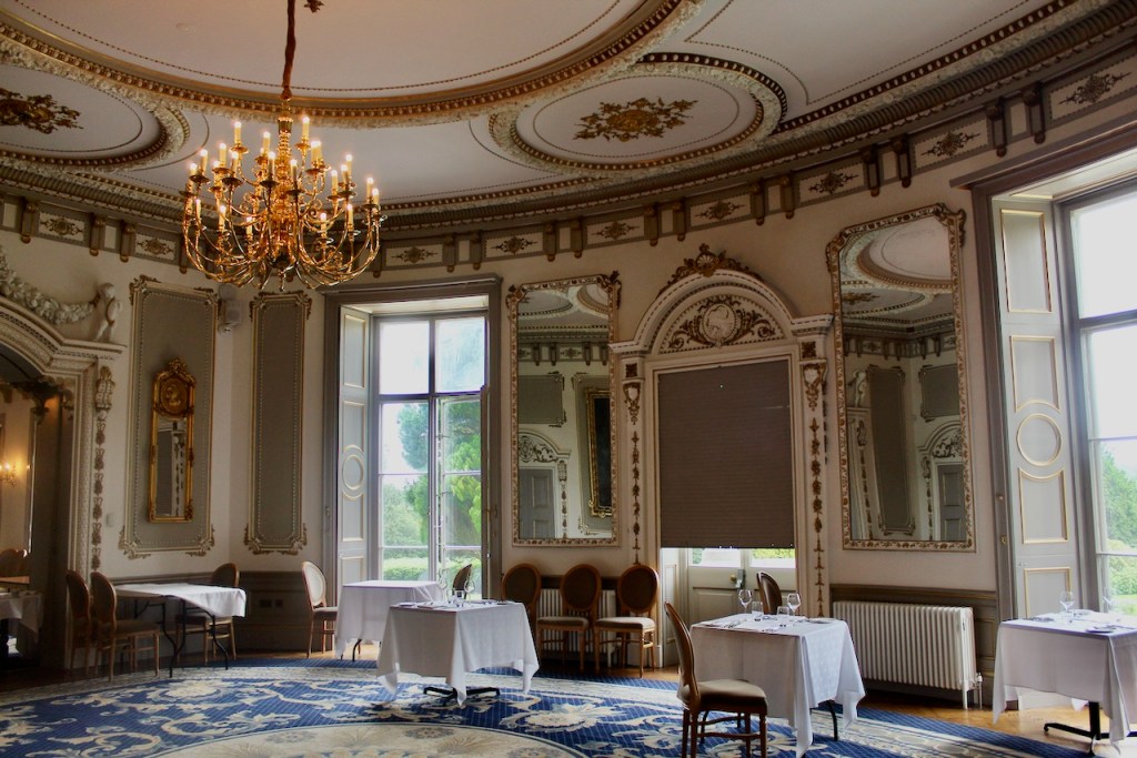 The large drawing room in Johnston’s round-faced tower in the middle of the garden front, and the ante-room adjoining it, which are now the dining room, were redecorated between 1837 and 1863 by Edward Joshua Cooper, MP, in an ornate Louis Quatorze style, with much gilding and “well-fed” putti in high relief supporting cartouches and trailing swags of flowers and fruits.