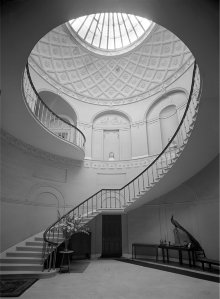 According to Mark Bence-Jones, the great top-lit galleried hall with a timbered roof is located where Johnston’s staircase used to be.