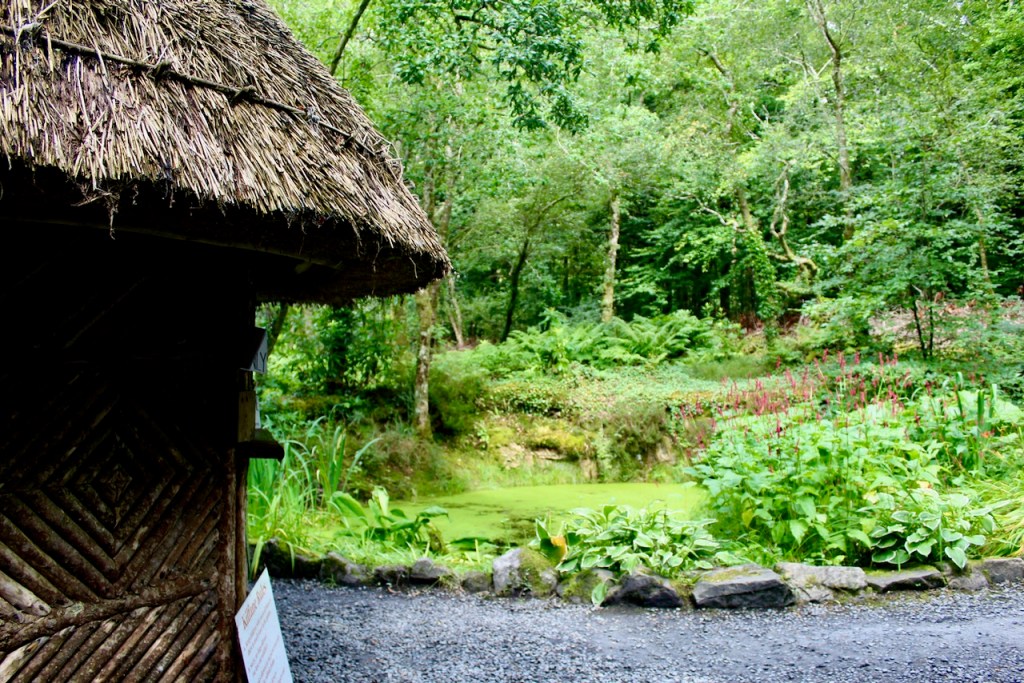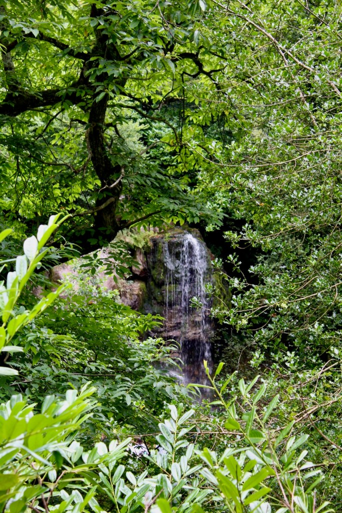 We drove through the woods to reach the car park for Kilfane Glen and Waterfall. The current owners have opened the gardens to the public and restored the key attraction, a romantic glen, waterfall, and cottage ornée in the style of Marie Antoinette’s Petit Trianon, a country-style cottage where she used to play at being a regular person. There is more to the gardens, however, than the glen. The glen, as Robert O’Byrne describes it, is on the edge of the estate: “there existed an area of woodland where the land dropped away to reveal a rock face thirty feet high descending to an open vale dramatically strewn with boulders.” The Powers added a mile-long canal leading to the glen, which spills down as a waterfall. A thatched cottage ornée was added – Robert O’Byrne tells us that advocates of the Picturesque argued that such landscapes needed a humanising focus in the same way as the paintings which had inspired them. There had to be a central point to which the eye was drawn. [4]