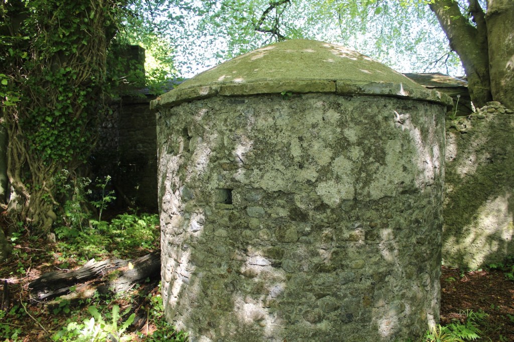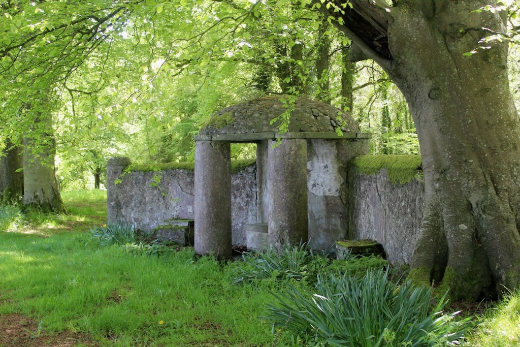 The National Inventory calls it a Mausoleum: “Mausoleum and folly, built c.1820. Comprising three-bay single-storey dressed limestone façade set into artificial mount, with rustic temple set on the mount. Pointed arch openings to three-bay façade. Rubble stone walls to site, with circular profile piers. Circular profile temple, comprising six columns, capped with dome. Rubble stone bridge to the site.” [9]