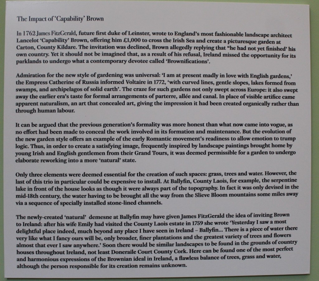 I recently visited the exhibition of “In Harmony with Nature: The Irish Country House Garden 1600-1900” at the Irish Georgian Society, curated by Robert O’Byrne. He describes the Romantic movement and landscape design of Capability Brown: