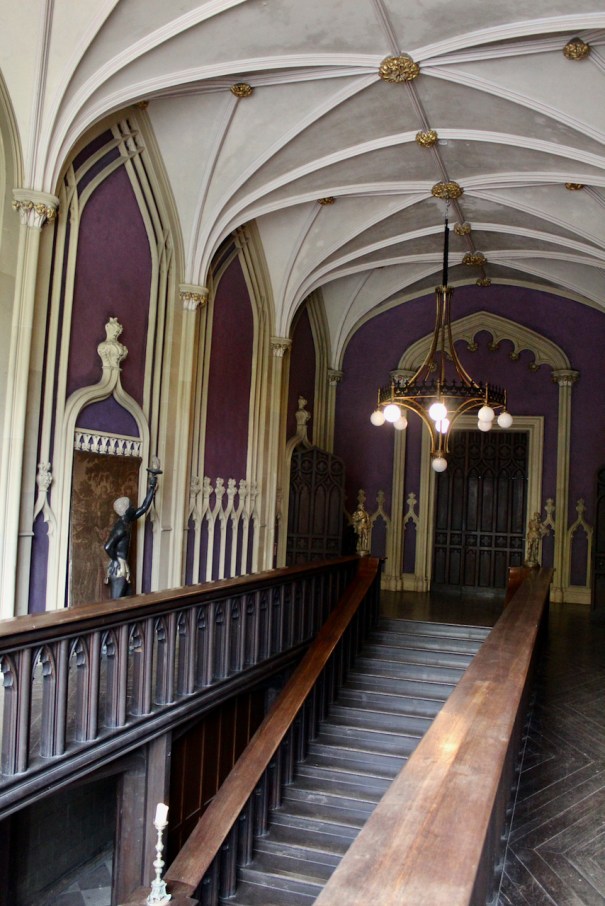 The interior is as dramatic and well-finished as the exterior. In the hall, with its plaster groined ceiling carried on graceful shafts, a straight flight of stairs rises between galleries to piano nobile level, where a great double door, carved in florid Decorated style, leads to a vast saloon or gallery running the whole length of the garden front.”