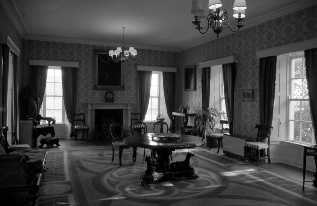 “The house, which is believed to have been first late-roofed house in this remote and mountainous part of the country, originally consisted of two unpretentious ranges at right angles to each other, probably built at various times between ca 1700 and 1745 and somewhat altered in later years; one range being of two storeys and the other mainly of two storeys and a dormered attic, which in second half of C18, became a third storey. Between 1745 and 1825 a wing was built at what was then the back of the house, this side towards Derrynane Bay; and in 1825 the great Daniel O’Connell extended this wing in the same unpretentious style with rather narrow sash windows; so that what had previously been the back of the house became the front, with reception rooms facing the sea. O’Connell also built a square two storey block with Irish battlements at right angles to his main addition, forming at attractive three sided entrance court, the other two sides being 1745-1825 wing and one of the original ranges. The battlemented block is weather-slated, as indeed all O’Connell’s additions were originally; he also weather slated some of the older parts of the house. Finally, in 1844, O’Connell built a new chapel in thanksgiving for his release from prison. It flanks the entrance court on the side furthest from the sea and is Gothic; based on the chapel in the ruined medieval monastery on Abbey Island nearby; it was designed by O’Connell’s third son, John O’Connell, MP. The interior of the house is simple, and the ceilings are fairly low. The two principal reception rooms are the drawing-room and dining-room which are one above the other in 1825 wing; they have plain cornices; the dining room has a Victorian oak chimneypiece, the drawing room an early C19 Doric chimneypiece of white marble. The benches and communion rail of the chapel are of charmingly rustic Gothic openwork. The house is now owned by the Commissioners of Public Works, who demolished one of the original ranges 1965 [due to poor structural condition]. The rest of the structure has been restored and is open to the public, the principal rooms containing O’Connell family portraits and objects related to Daniel O’Connell’s life and career.” [5]