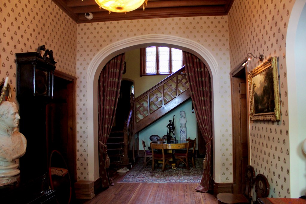 Curtains hang on the back of the front door. The use of portiére rods with drapes were extensively used in Victorian homes to keep out draughts. The wallpaper is modern, supplied by Watts of London, and it copies an original Pugin design. All of the woodwork in the house is the original pitch pine, and has many Gothic details. The ceiling beams in the main hall have moulded ribs. The door to the right before the Tudor arch leads to the dining room, and to the left, the front drawing room.