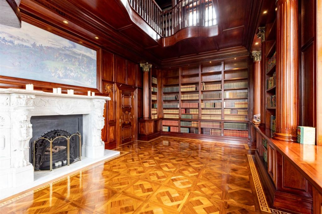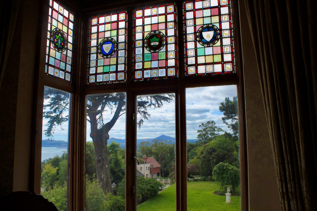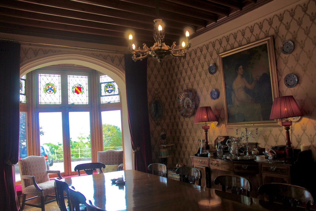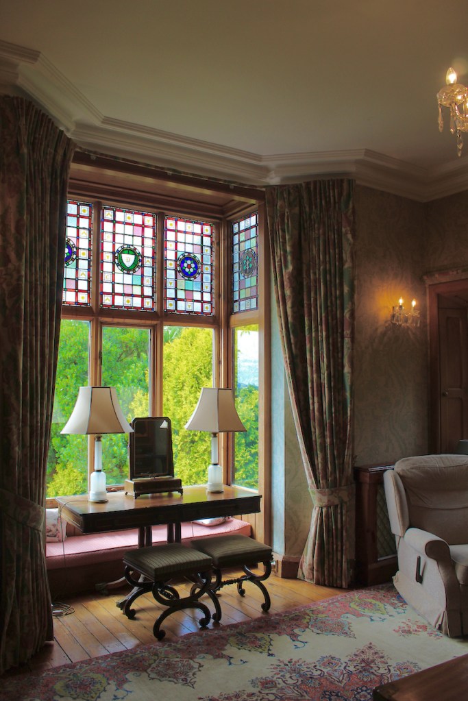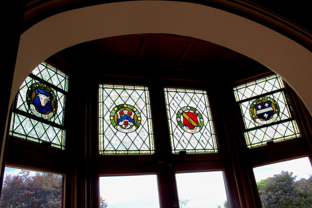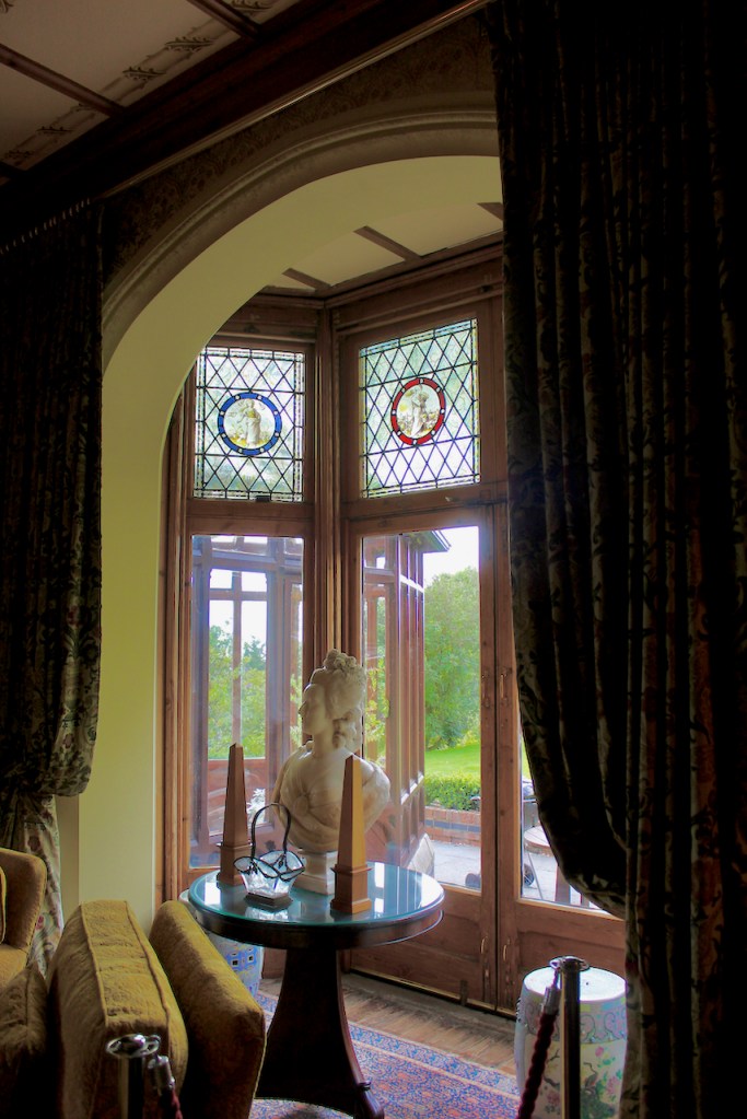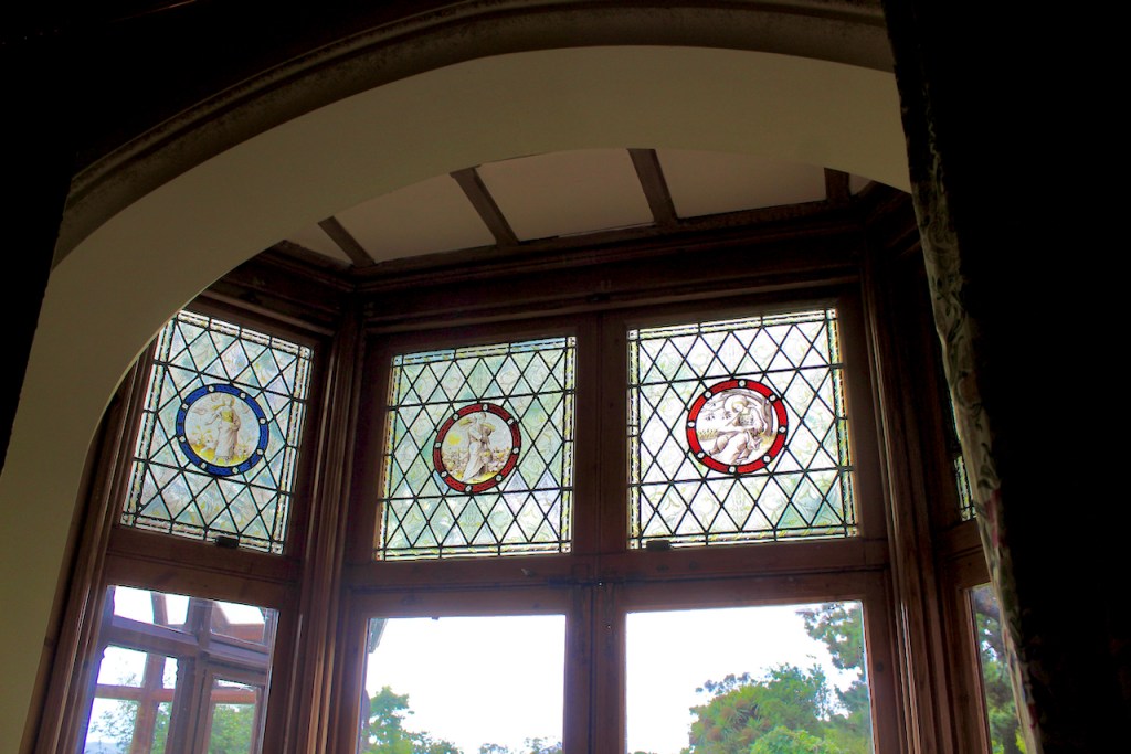 The library is located at the top of an “elbow stairs.” It is completely covered in pitch pine and has a magnificent view of the coast. The stained glass is signed “Frampton” and dated to 1880.