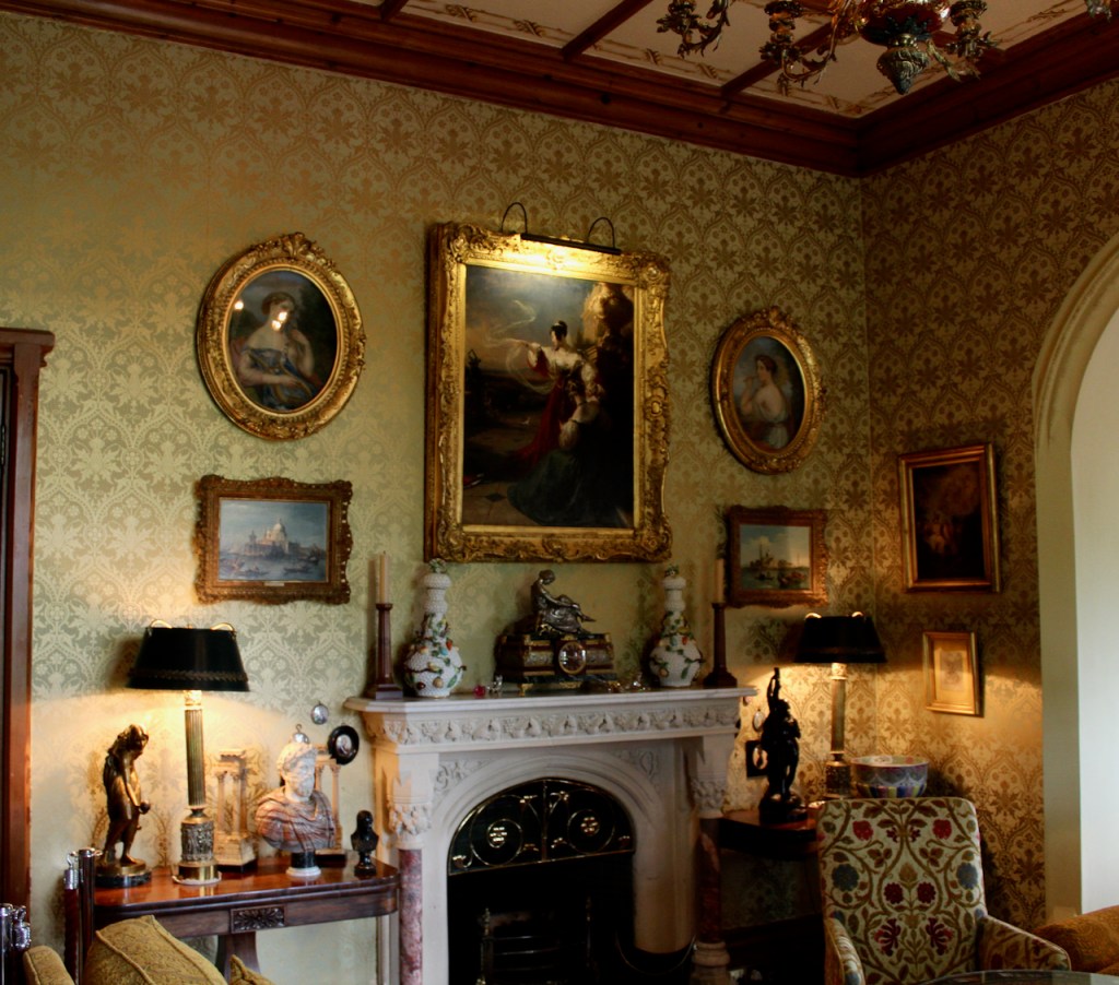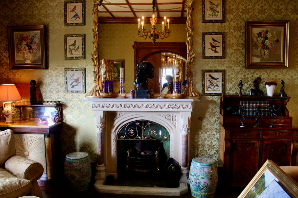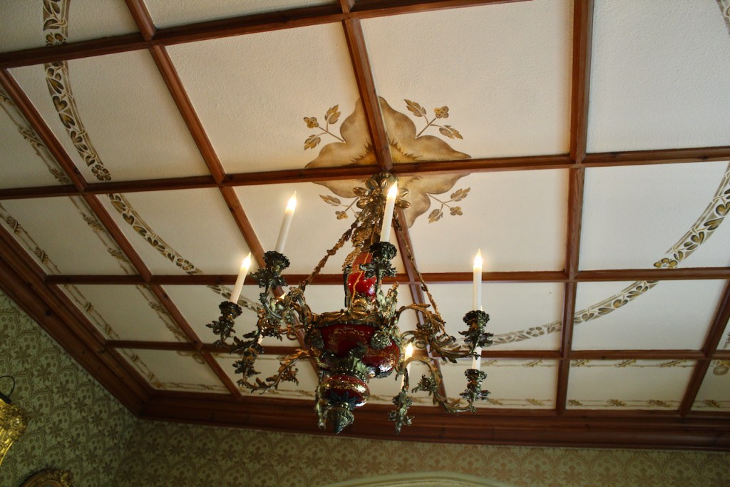 The Front Drawing Room and back study, the leaflet from St. George’s tells us, are interconnecting spaces in the manner of Pugin’s design for The Grange where Ashlin’s wife grew up. Again, the wallpaper and drapes are of Pugin’s design. The fireplace has the inscribed initials of G.A. for George Ashlin. The ceiling is stencilled, which is a feature of Pugin’s domestic designs. The area beyond the arch was initially a Gothic conservatory. There are two canted bays, one with French doors out to the lawn. The stained glass panels in one depict the four seasons and in the other, figures of music, painting, poetry and architecture.