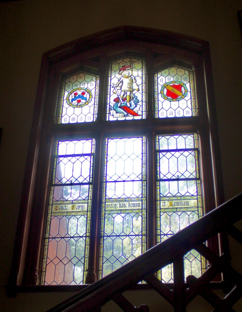 The window which lights the stairs is a three light window in heavy timbered frame with vertical glazed panels. The stained glass depicts St. George, and on one side is the Ashlin crest and the other, the Pugin crest, with G. (George) and M. (Mary) initials.