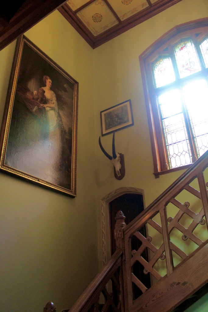 The bedrooms are placed facing the sea and to the south, with bathrooms at the back of the house. The bedroom in front was probably Mary’s, as it has the initials “M.A.” in the fireplace. The stained glass in that room contains symbols of the Ashlin-Pugin marriage.