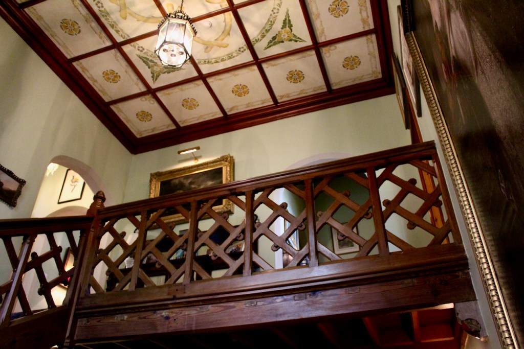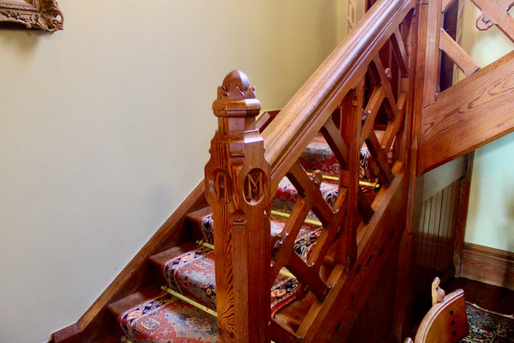 The Back Hall is double height, with a pitch pine staircase winding around the sides. The staircase is similar to that in Mary Pugin’s childhood home, The Grange. The stairs feature St. Brigid cross shapes and on the newels, more initials carved for George and Mary.