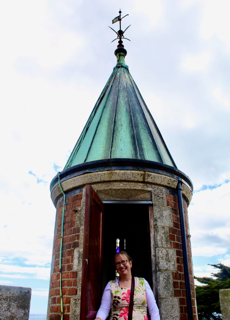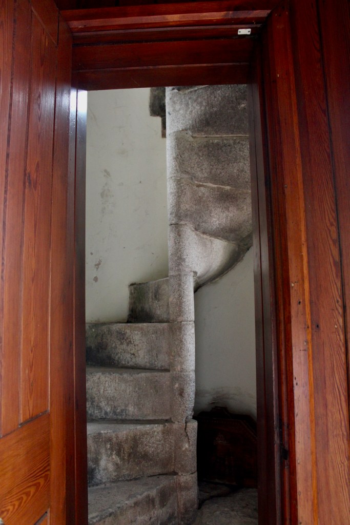 There is a door in the corner which leads to a spiral granite staircase up on to the turret.