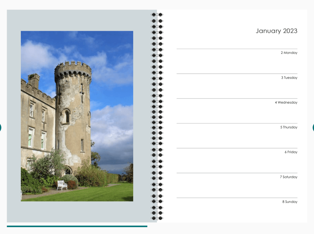 I have made some diaries for 2023, and ordered a few extra ones to sell if anyone is interested. It’s a 14.9 x 21.3 cm date book, €18 each, with a page per week, all with Section 482 houses pictured.