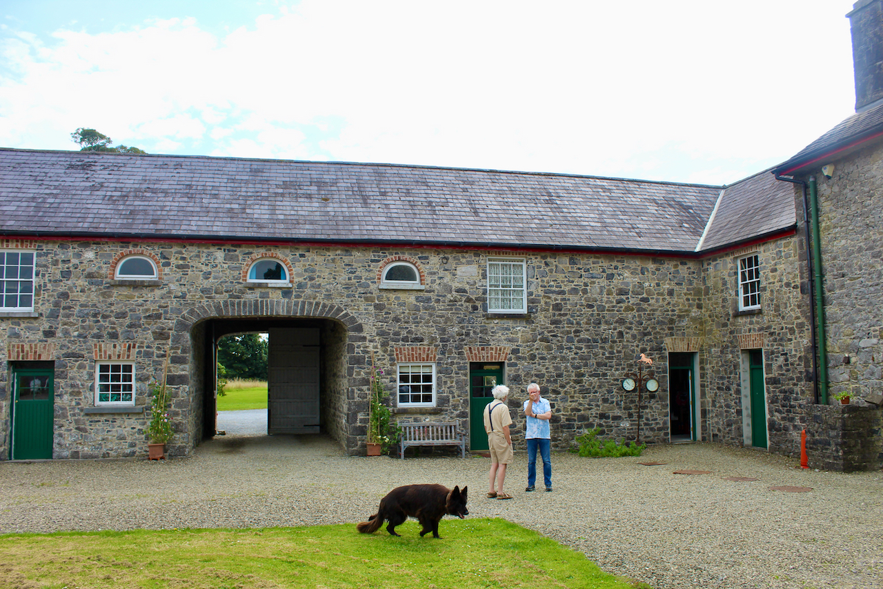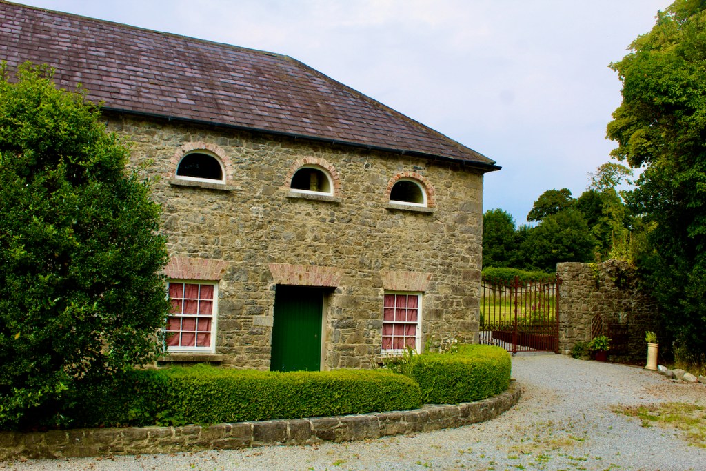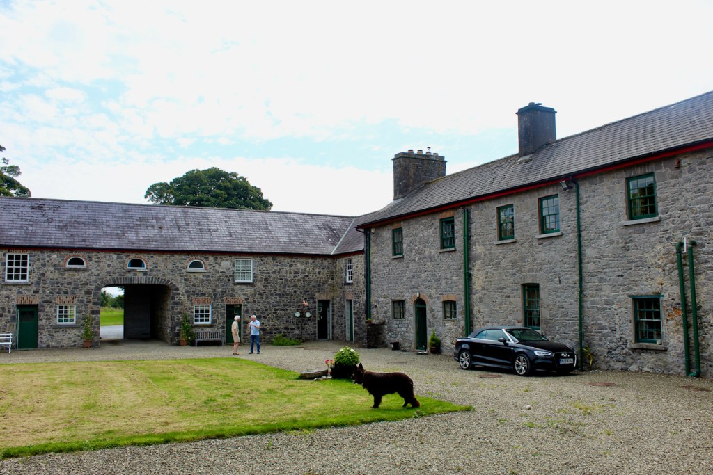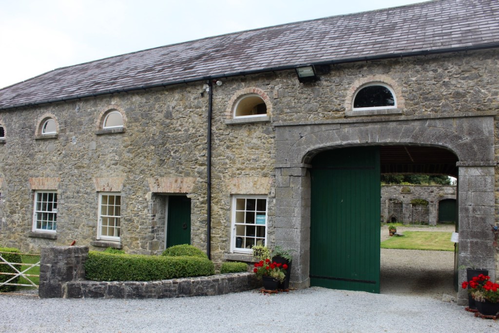 We drove up a long drive with fields on either side, to a stone courtyard entrance, with geraniums in tubs on either side of a fine carriage entrance. The farm buildings have semi-circular lunette windows in the upper level and brick surrounds to the windows. A Keystone reads: ‘WM/AD/1803’ and the National Inventory of Architectural Heritage tells us that Glenville was built in 1803 by William Massey (1747-1830). [1]