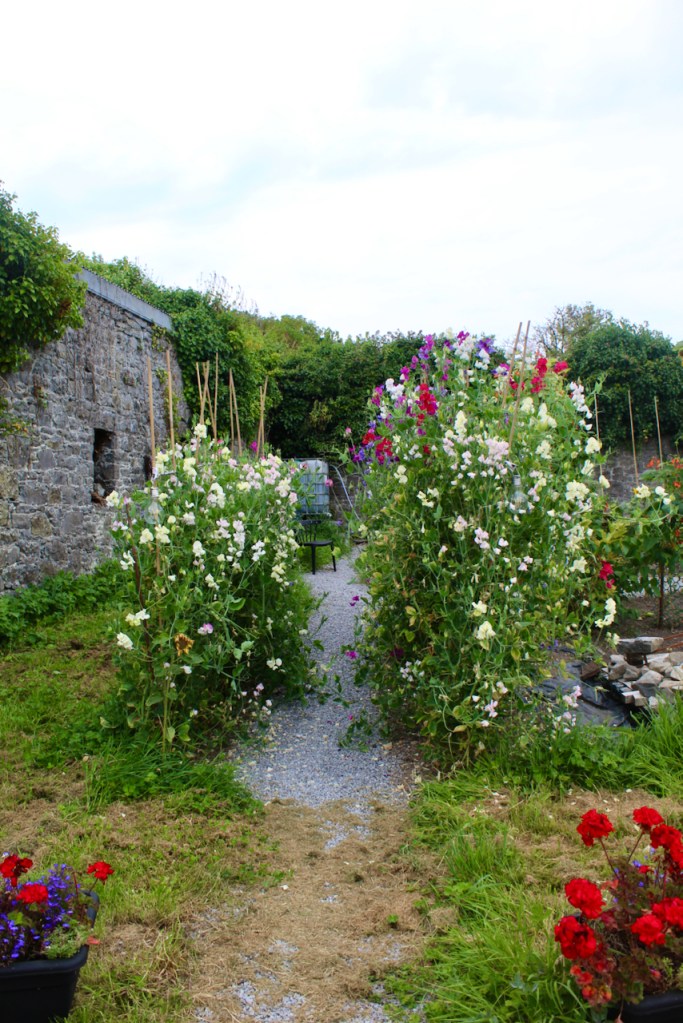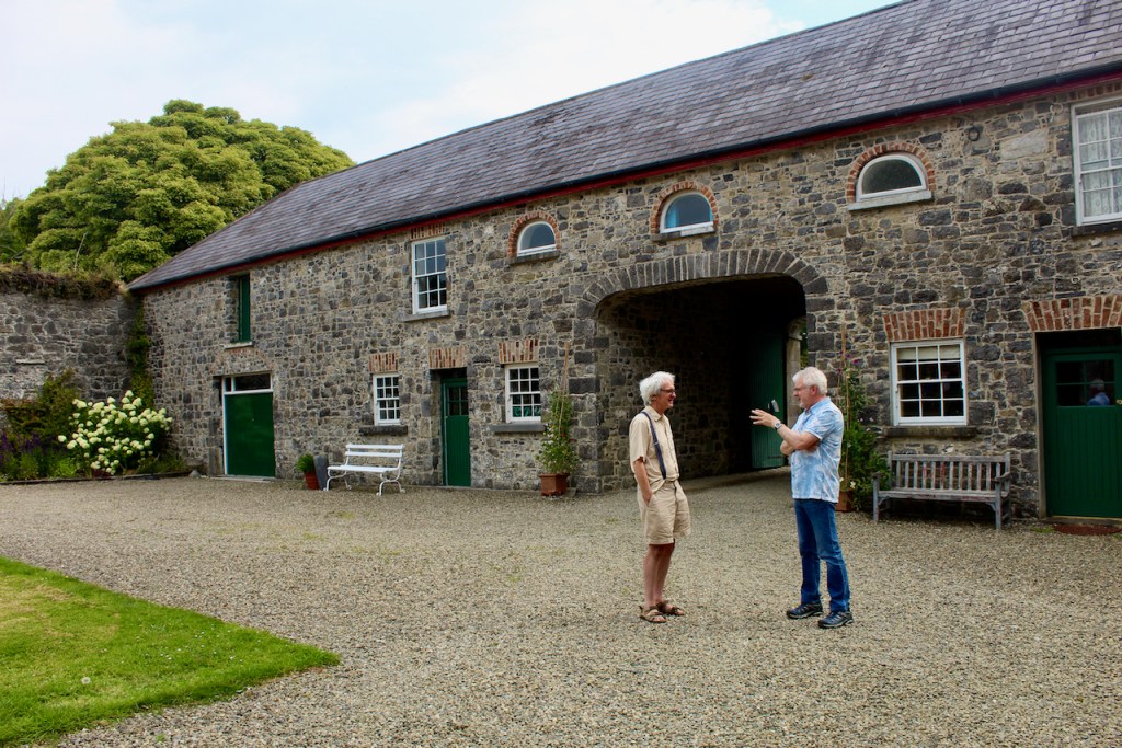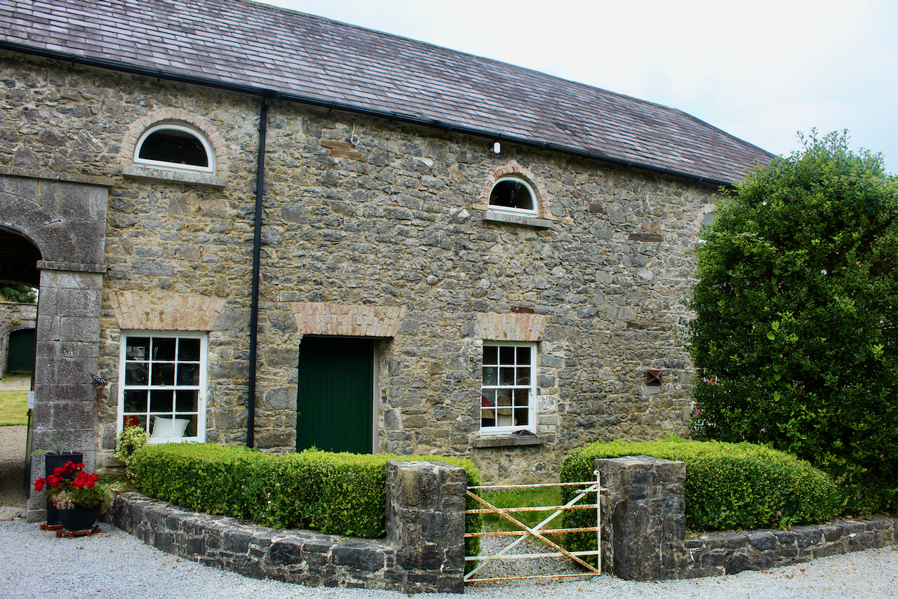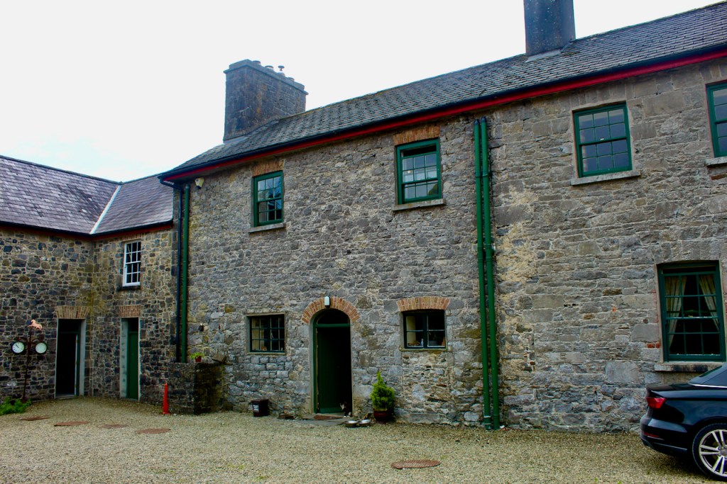 We drove up a long drive with fields on either side, to a stone courtyard entrance, with geraniums in tubs on either side of a fine carriage entrance. The farm buildings have semi-circular lunette windows in the upper level and brick surrounds to the windows. A Keystone reads: ‘WM/AD/1803’ and the National Inventory of Architectural Heritage tells us that Glenville was built in 1803 by William Massey (1747-1830). [1]