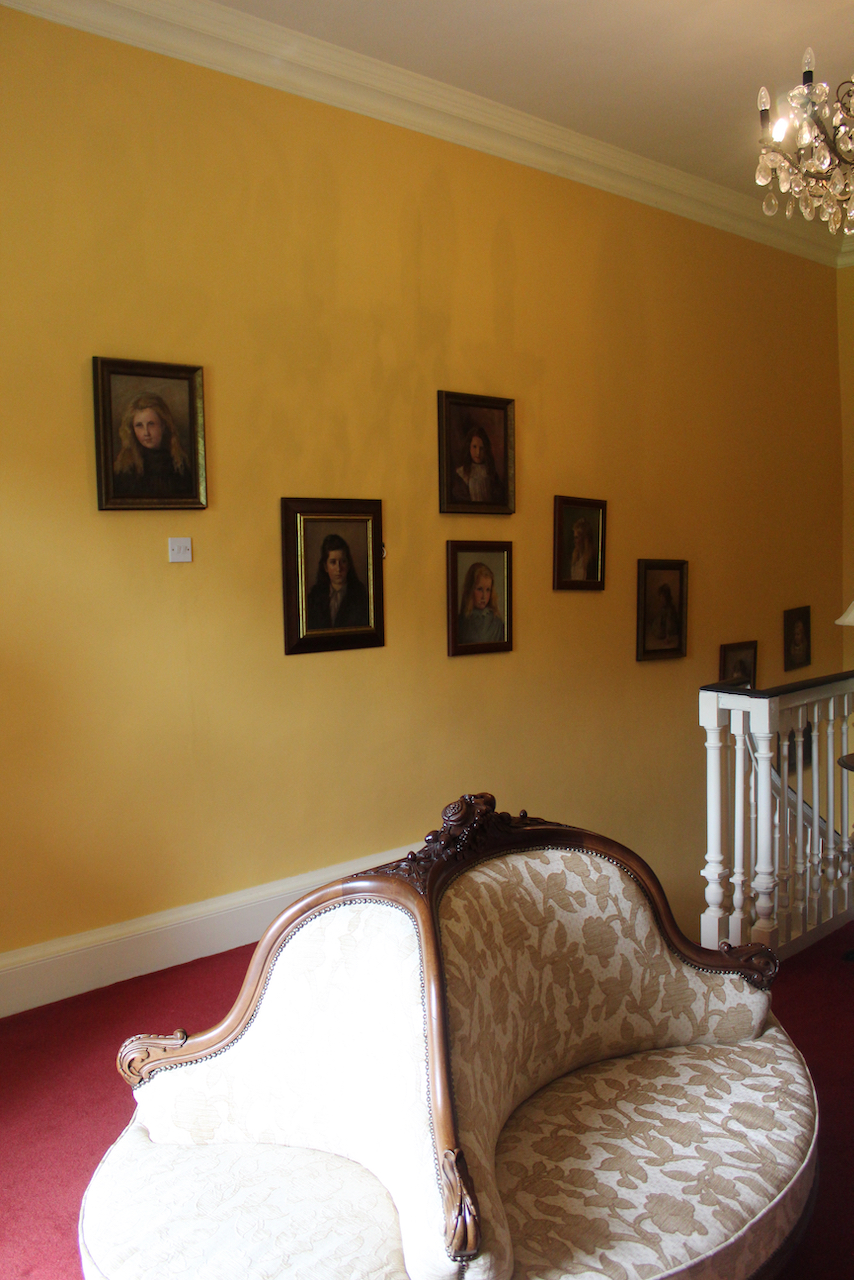 Upstairs has a lovely landing, with this conversation chair, suitable for courting couples and a chaperone! The current owners found the paintings in the house. They belonged to the previous owners, the Langfords. Photograph © Jennifer Winder-Baggot, www.irishhistorichouses.com