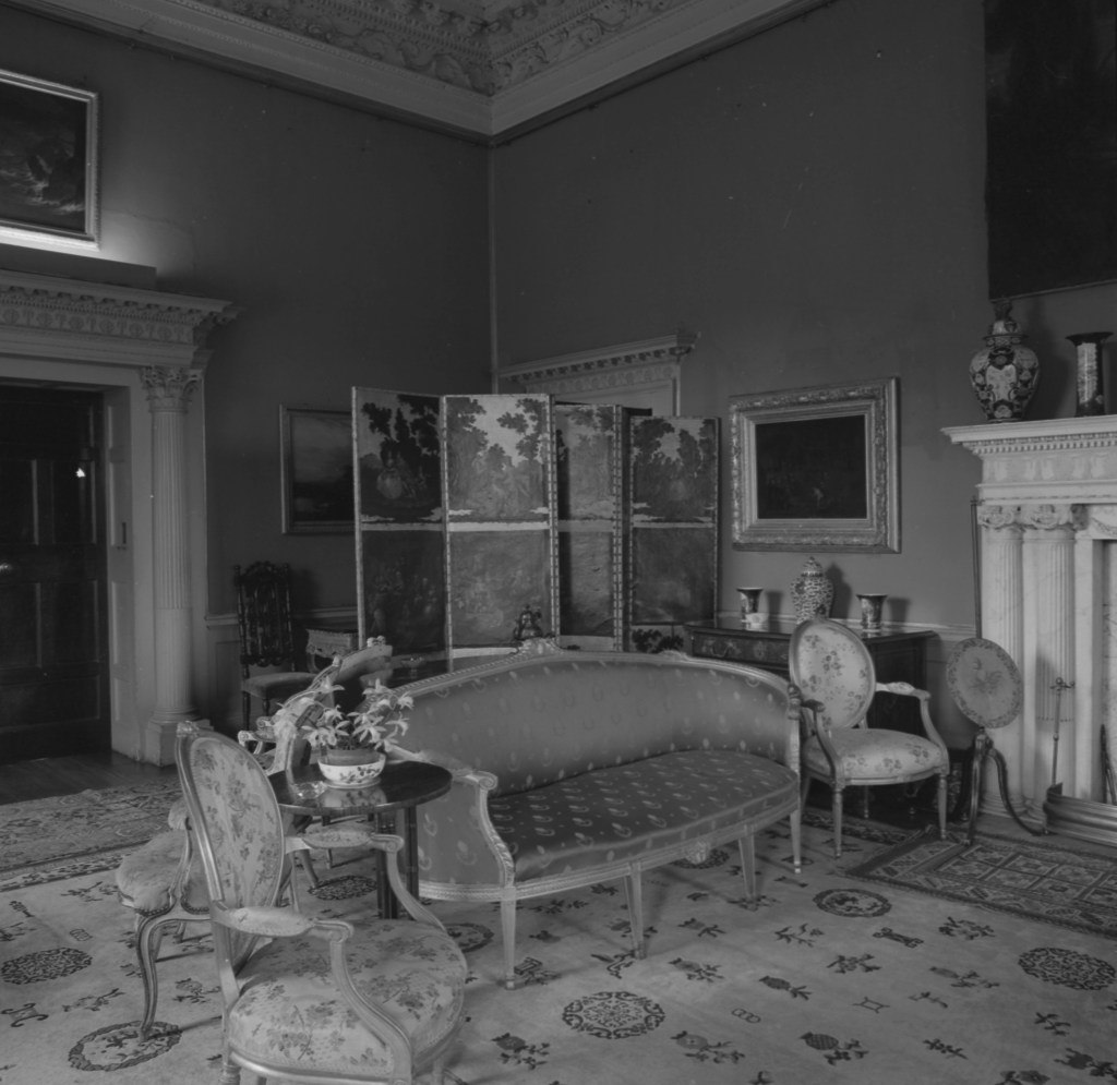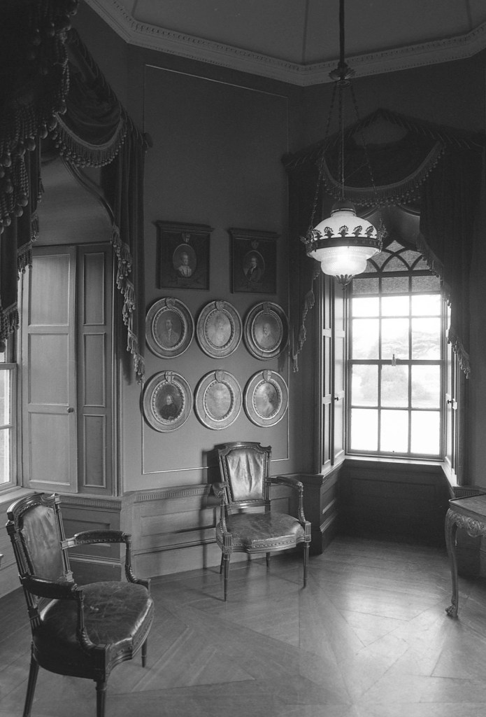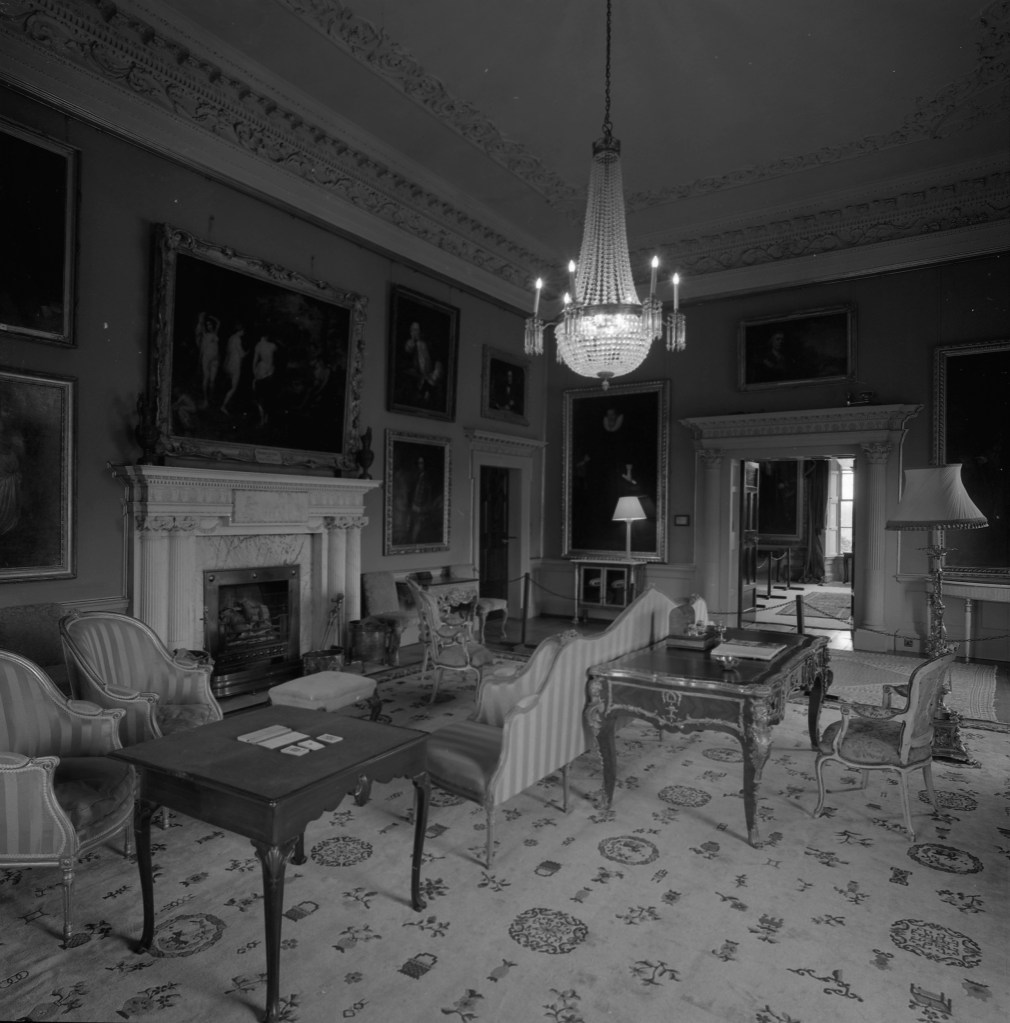 Mark Bence-Jones continues: “The doorway between the two rooms has on one side a doorcase with a broken pediment on Ionic columns. The walls of the two drawing rooms are painted a subtle shade of orange, which makes a perfect background to the pictures in their gilt frames.