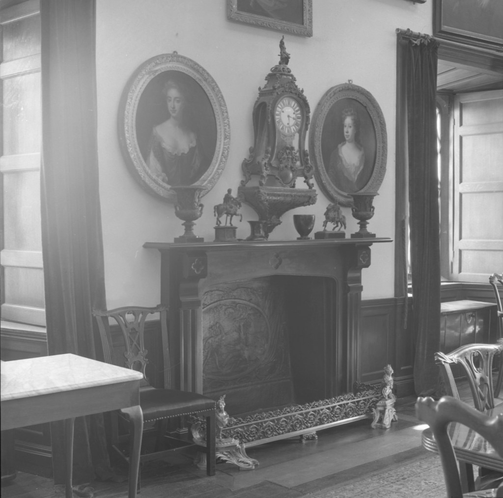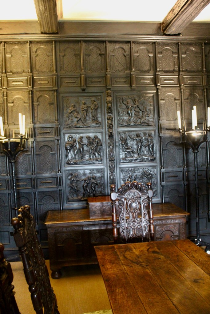 Behind the carved panels on the wall to the right hand side of the fireplace is a door that acted as an escape route for Catholic priests when Catholic mass was held in this room.