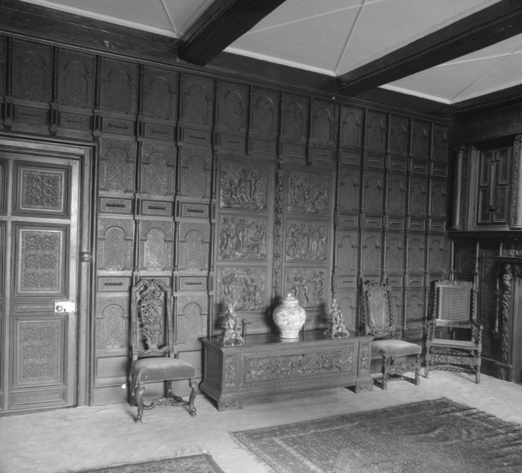 According to tradition, Mark Bence-Jones tells us, the carving of the Coronation of the Virgin above the fireplace of the Oak Room miraculously disappeared when the castle was occupied Myles Corbett and reappeared when the Talbots returned after the Restoration. This would have been a Catholic tale, as Protestants do not believe in the virgin birth and would not venerate Mary the mother of Jesus in the way that Catholics do. The carving is seventeenth century Flemish.