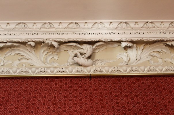 “Robert was a property developer as well as a stuccodore, which provided a ready-made market for his team of plaster workers. In 1757 he leased two adjacent plots on what is now Lower Dominick St. The surviving plaster work in number 20, which is attributed to West and his circle, is among the most daring rococo plasterwork to be found anywhere in Ireland. Menacing birds perch on pedestals, and naturalistic busts of girls, sea-pieces, and bowls of flowers are sculpted with great sensitivity. West is associated with the plasterwork in about ten town houses in Dublin such as 4 and 5 Rutland (latterly Parnell) Square and 86 St Stephen’s Green. All of these interiors date from c.1756 to 1765. West is not connected to any plasterwork between 1765 and his death in 1790.“