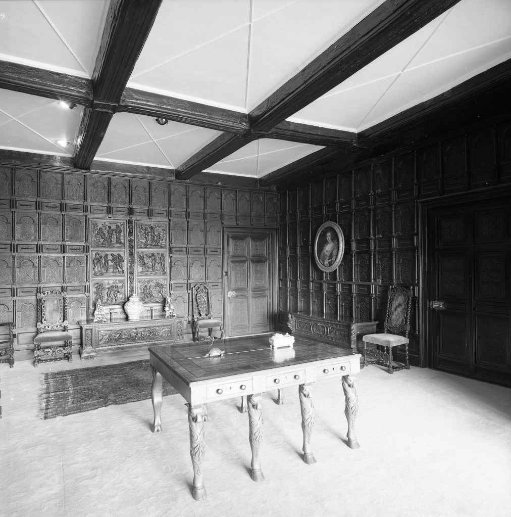 The oak room is lined with oak panelling, elaborately carved. The carvings would have originally been part of older furniture. The panelling would have made the room warmer than having bare stone walls or limewash. The panels were painted white to make the room brighter as the windows would have been small to keep out the cold and to protect against invaders.