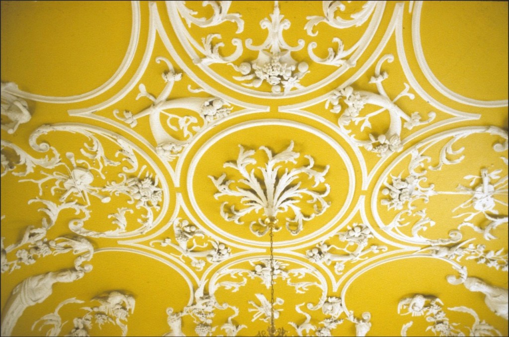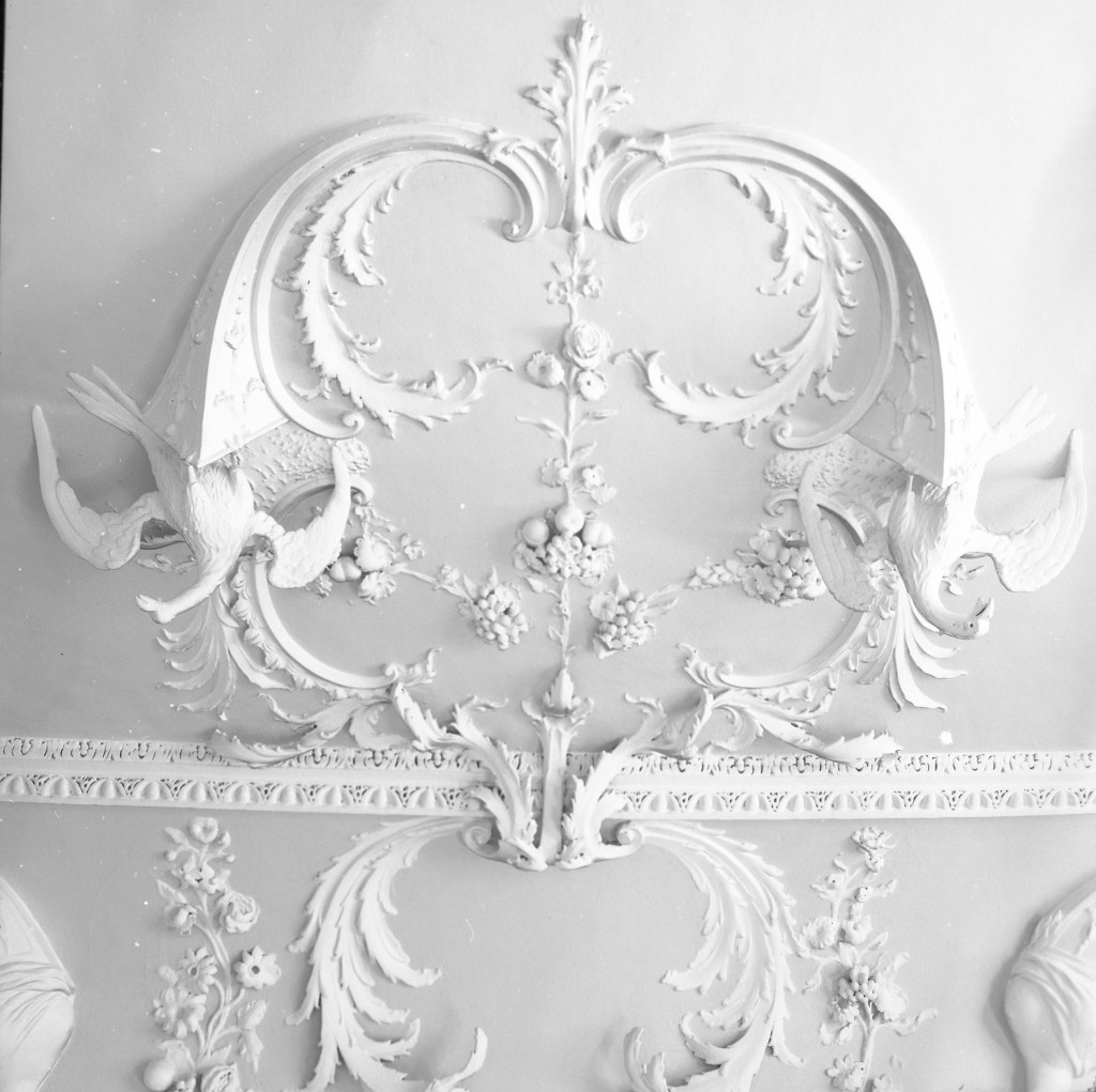 “West is often confused with Robert West (d. 1770), artist and draughtsman, who lived in Dublin at the same time and was a teacher of applied arts such as stucco design as well as life drawing. Though there is no evidence that the two men were blood relatives, they would almost certainly have known of each other’s work. Continental prints, showing ceiling designs by artists such as Bérain, Pineau, and Boucher, were commonly circulated among craftsmen and students in Dublin during the 1750s and 60s. Robert West the artist may have provided inspiration for some of the motifs (such as birds, swags, and musical instruments) used by West the stuccodore. The design and fixing of plasterwork was a complex collaborative venture involving many hands, and it is rarely possible to attribute plasterwork designs to a single artist. It is known that Robert worked alongside his brother John West and he would have required a team of assistants.“