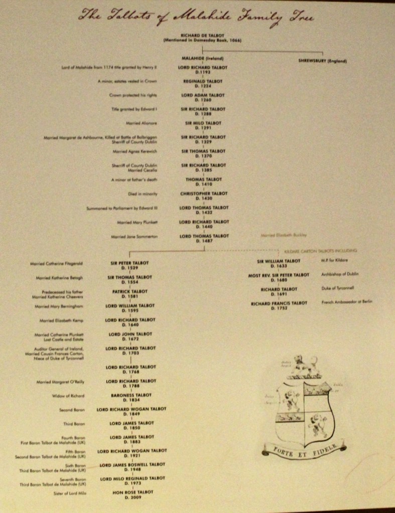 The website of the Malahide Historical Society tells us that in 1641 John Talbot (d. 1671) succeeded his father Richard to the lordship of the Talbot estates in Malahide, Garristown and Castlering (Co. Louth).