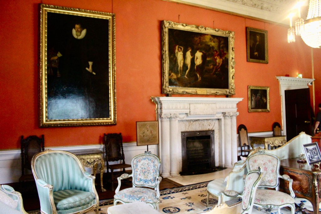 The pair of “Malahide Orange” painted drawing rooms which contain rococo plasterwork in the manner of Robert West and the Dublin school also have decorative doorcases and marble fireplaces and are now filled with portraits and paintings.