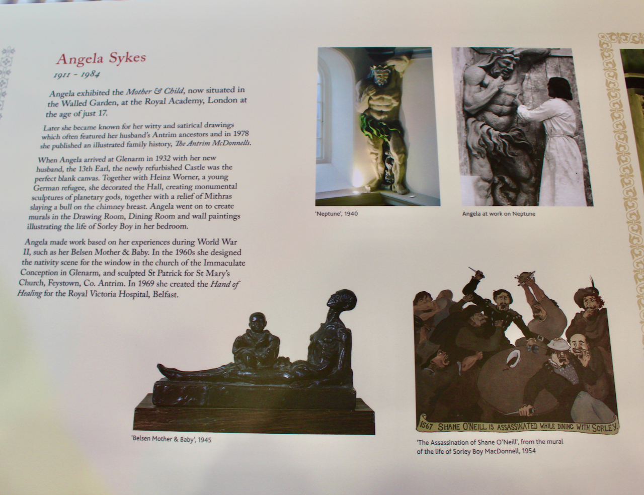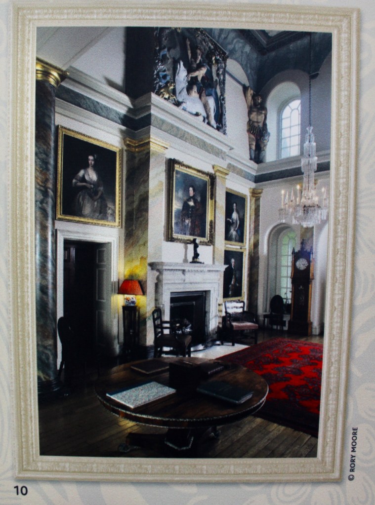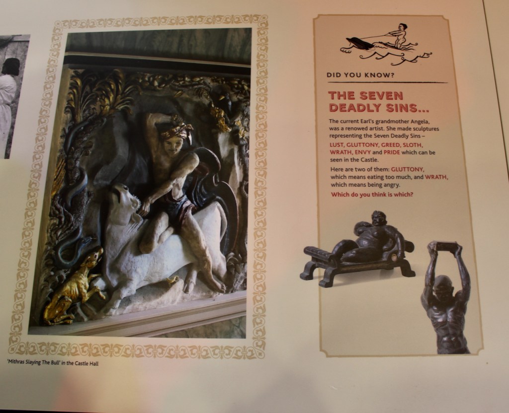 Angela Sykes (1911-1984), wife of the 8th or 13th Earl was an artist and she created the rather bulging statues of planetary gods that adorn the ceiling corners of the front hall. She also designed Mithras slaying the bull over the fireplace. She also created murals in the dining room, drawing room and in her bedroom.