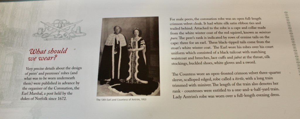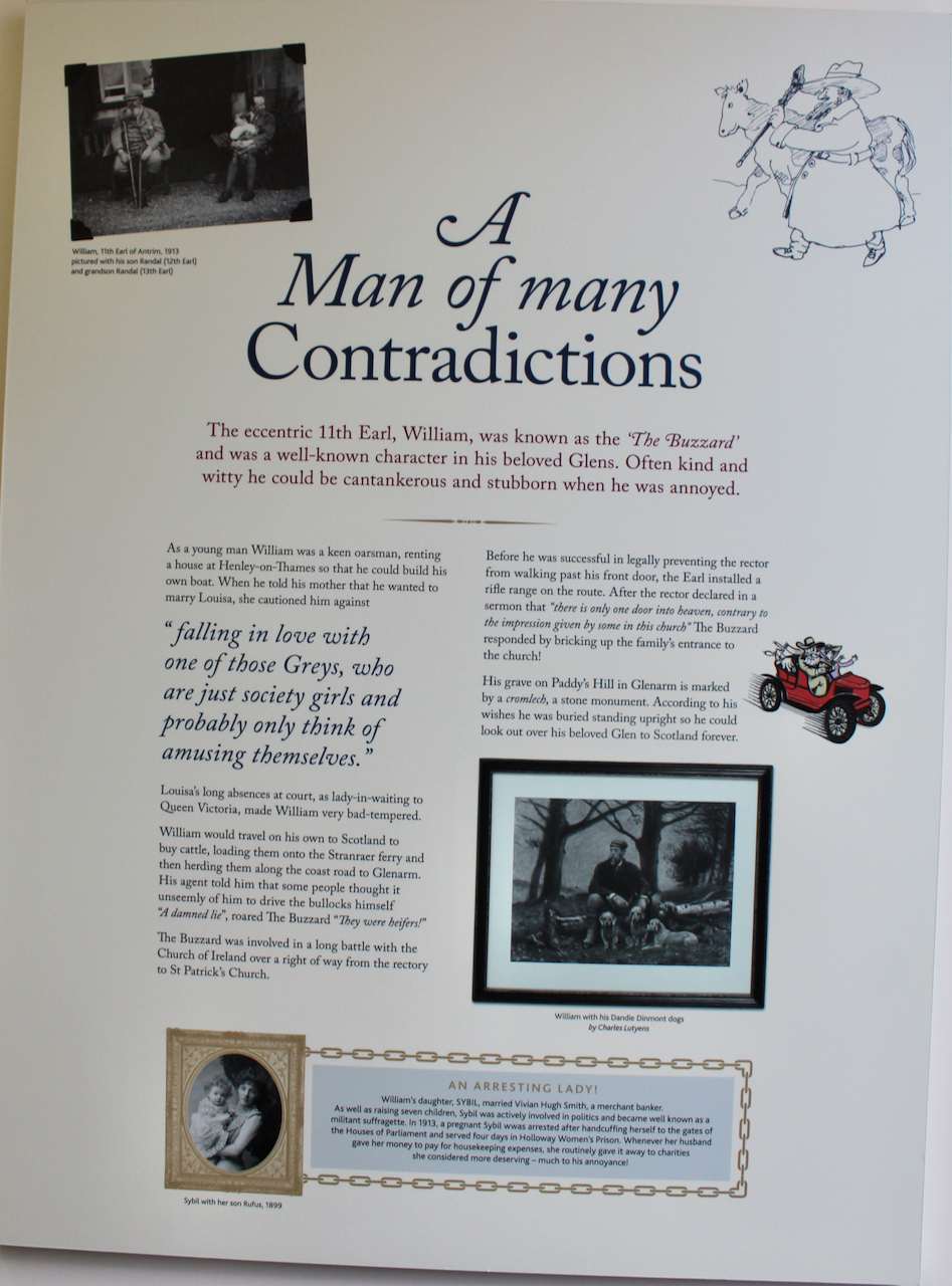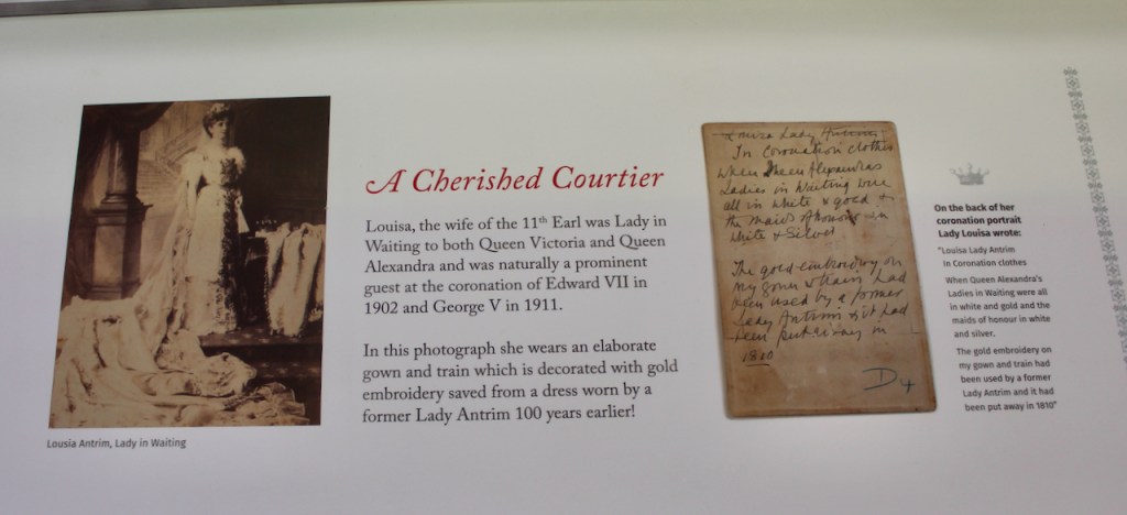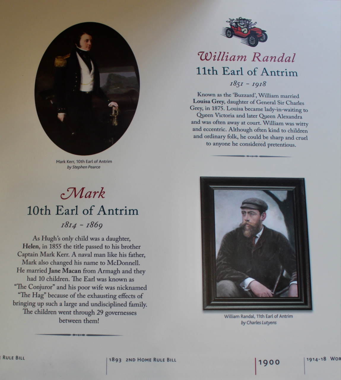 Mark’s son William Randal McDonnell (1851-1918) succeeded as 6th/11th Earl of Antrim. He held the office of Deputy Lieutenant (D.L.) of County Antrim. In the information panel in the museum at the castle, he is referred to as the 11th Earl. He married Louisa Jane Grey. She held the office of a Lady of the Bedchamber to Queen Victoria between 1890 and 1901.