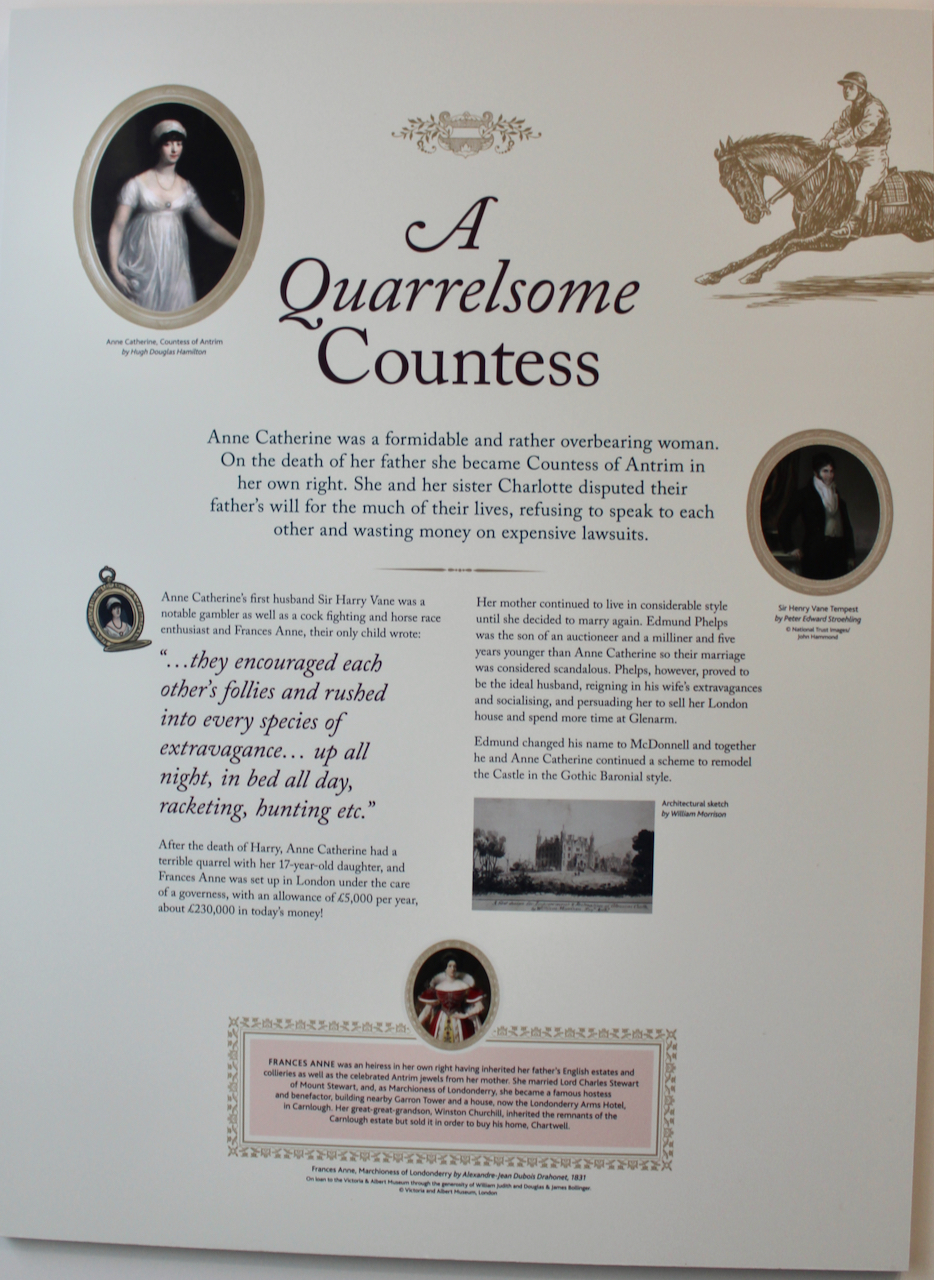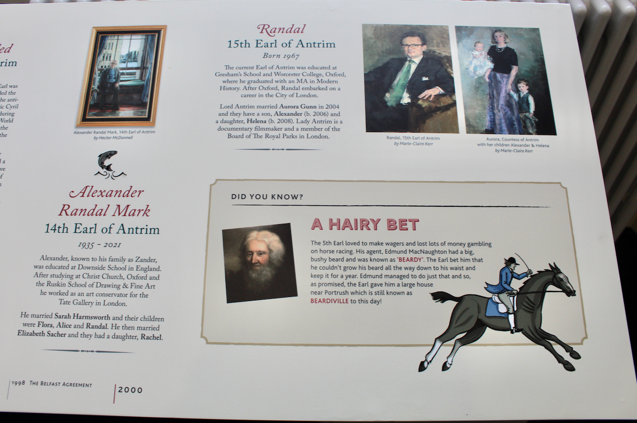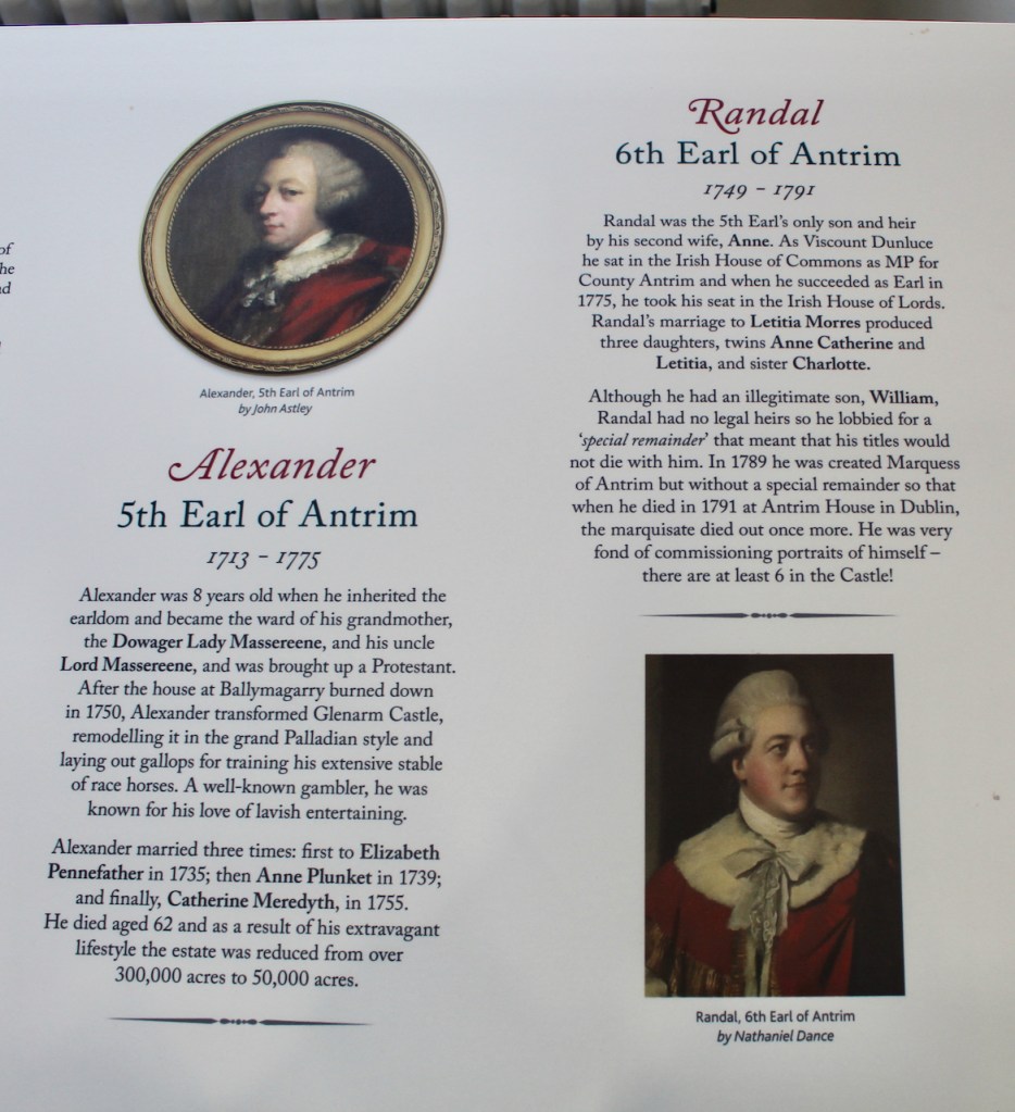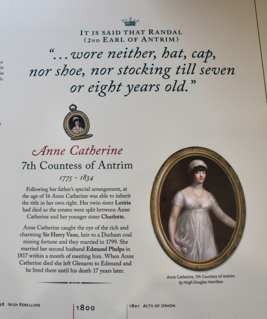 His eldest daughter Anne Catherine (1778-1834) became 2nd Countess of Antrim in 1791 when her father died. Anne Catherine’s sister Letitia Mary predeceased her. When Anne Catherine died in 1834 her sister Charlotte became 3rd Countess of Antrim. Charlotte’s sons became the 4th and 5th Earls of Antrim (the Countesses being in lieu of the 2nd and 3rd Earls). The descendants still live in the castle.