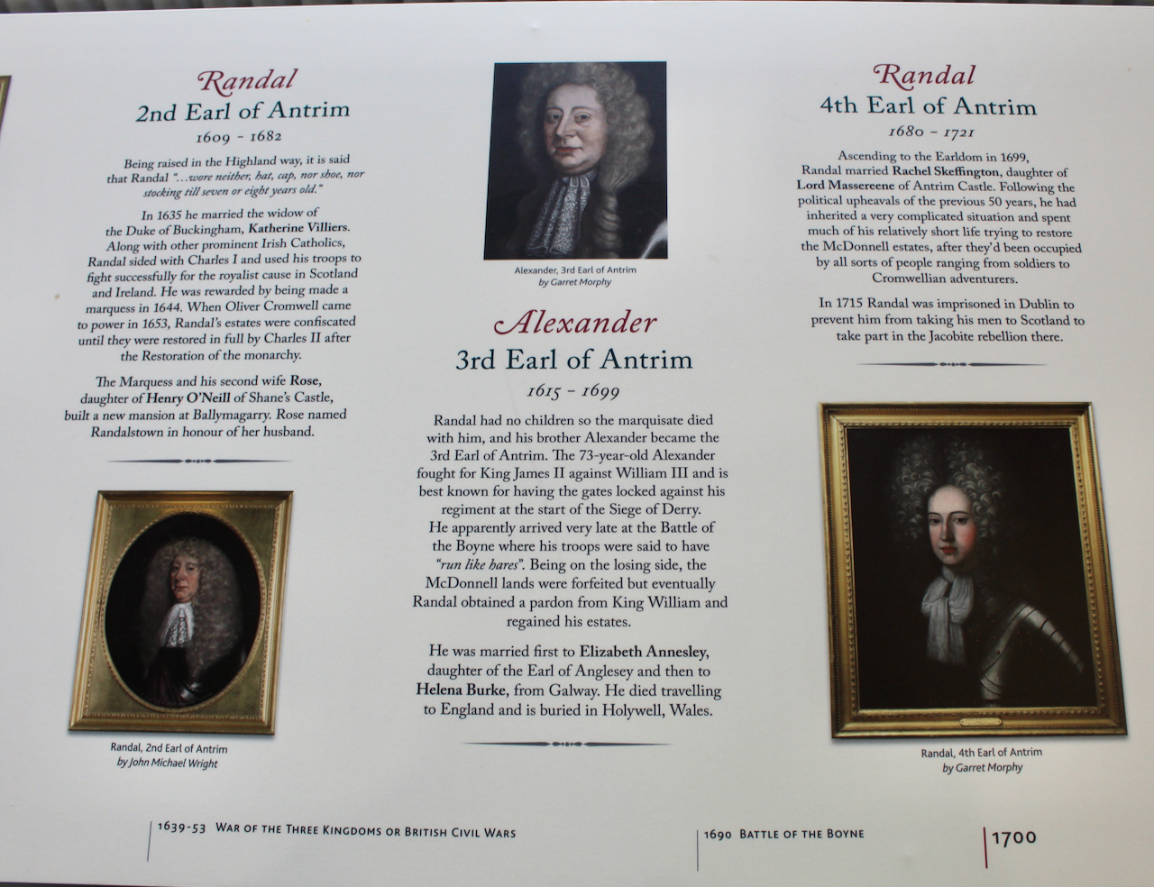 We learned of the 1st and 2nd Earls of Antrim on our visit to Dunluce Castle in Antrim. When the 2nd Earl died in 1682 his brother Alexander (1615-1699) became 3rd Earl of Antrim. He first married Elizabeth Annesley, daughter of the 1st Earl of Anglesey.