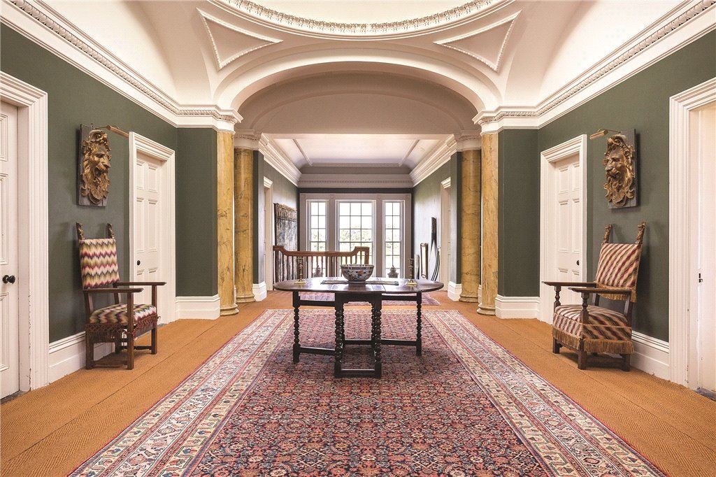 The drawing room and dining room are on either side of the entrance hall. The dining room on the west side has a coffered ceiling and a fireplace which is a copy of the west door of Magdalen College chapel, Oxford.