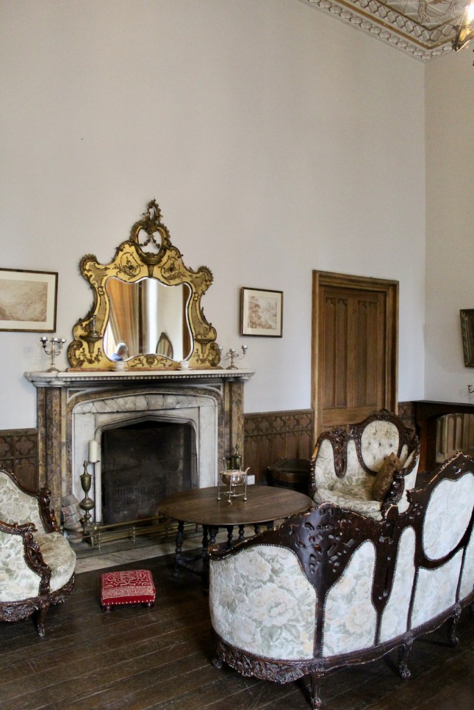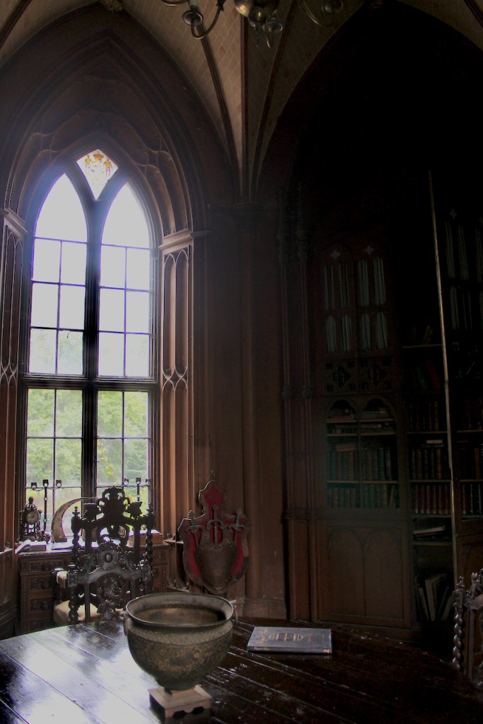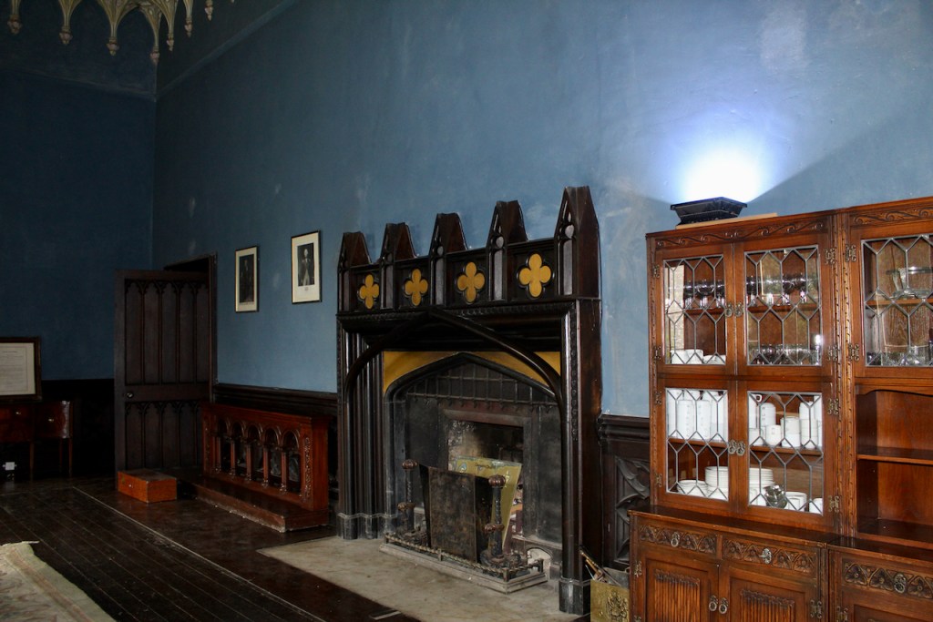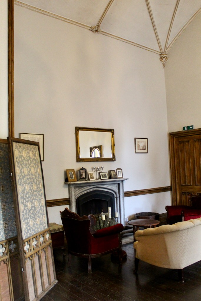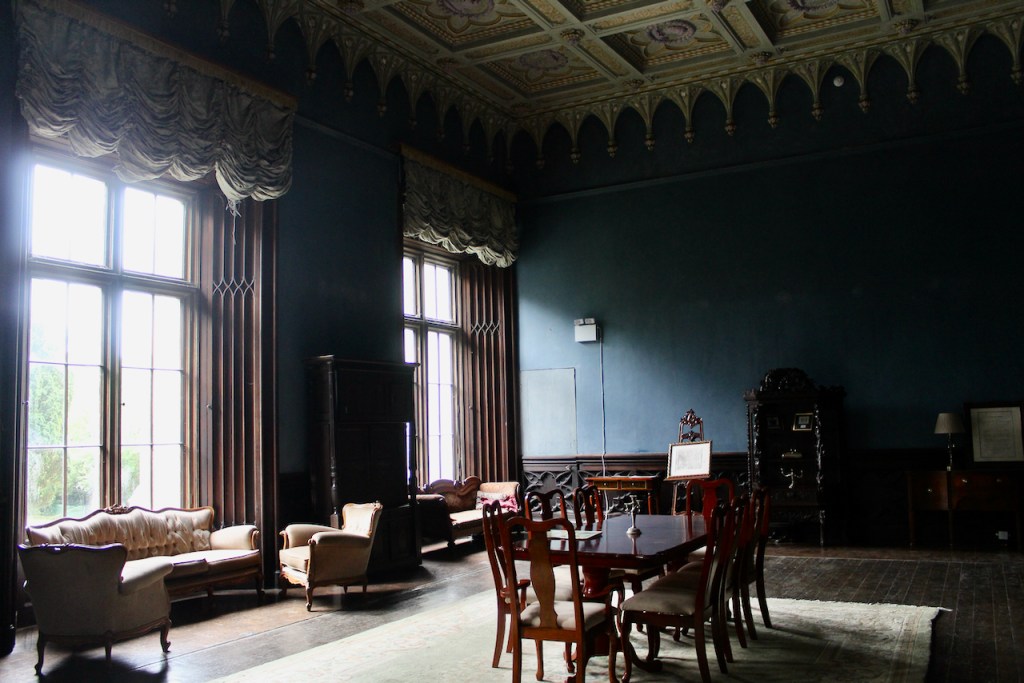 Through the double doors is the most splendid room, the south facing Gallery. Unfortunately this was closed on our Heritage Week visit in 2024 due to filming of the Addams family movie, “Wednesday.” Mark Bence-Jones continues:“This is one of the most splendid Gothic Revival interiors in Ireland; it has a ceiling of plaster fan vaulting with a row of gigantic pendants down the middle; two lavishly carved fireplaces of grained wood, Gothic decoration in the frames of the windows opposite and Gothic bookcases and side-tables to match.“