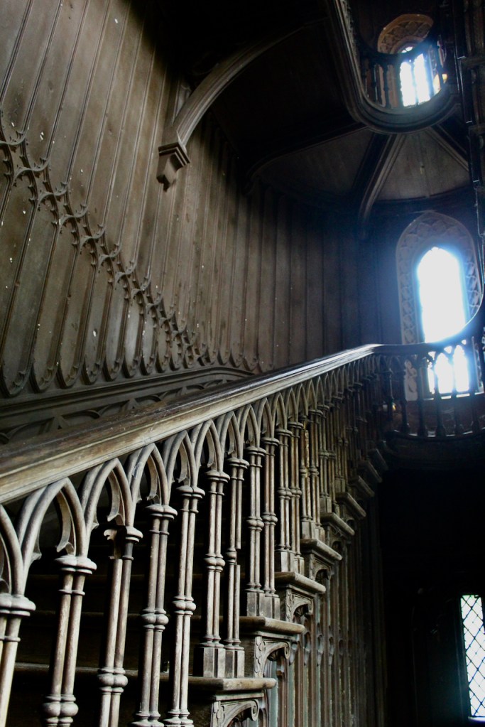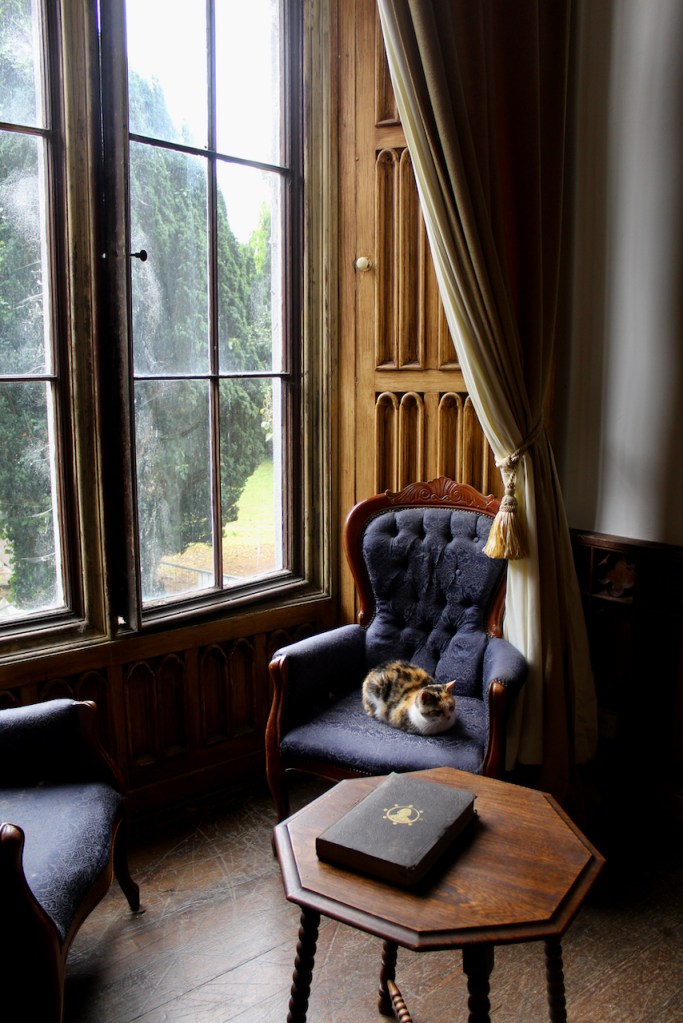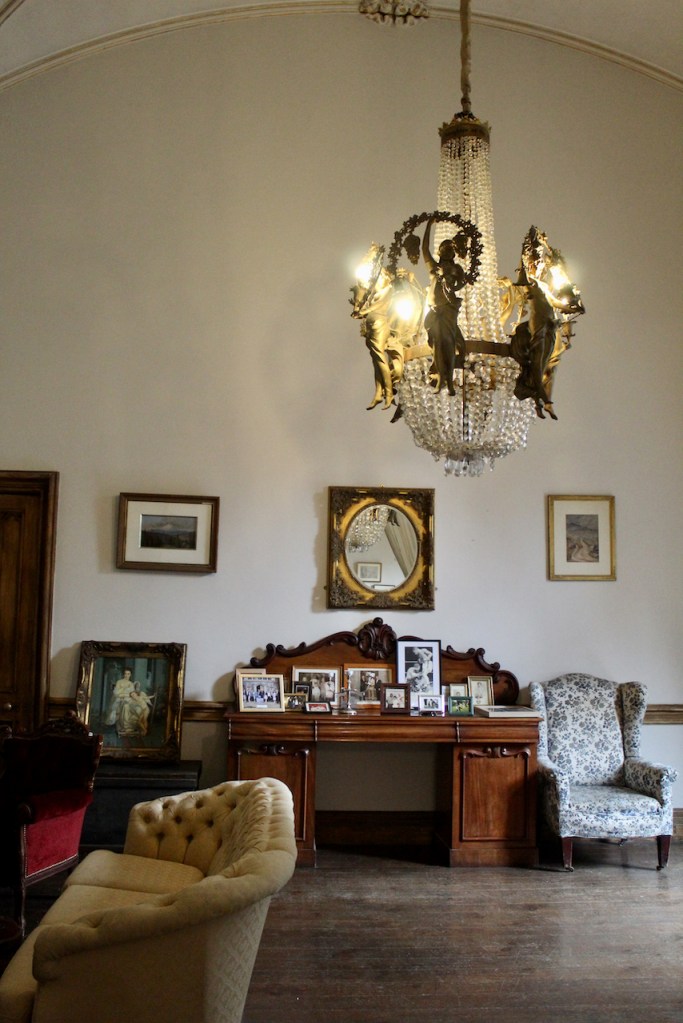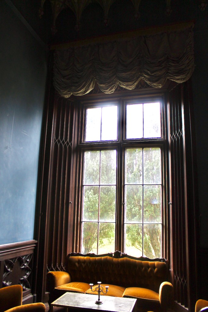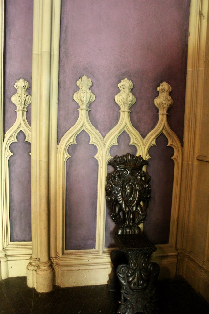 Through the double doors is the most splendid room, the south facing Gallery. Unfortunately this was closed on our Heritage Week visit in 2024 due to filming of the Addams family movie, “Wednesday.” Mark Bence-Jones continues:“This is one of the most splendid Gothic Revival interiors in Ireland; it has a ceiling of plaster fan vaulting with a row of gigantic pendants down the middle; two lavishly carved fireplaces of grained wood, Gothic decoration in the frames of the windows opposite and Gothic bookcases and side-tables to match.“