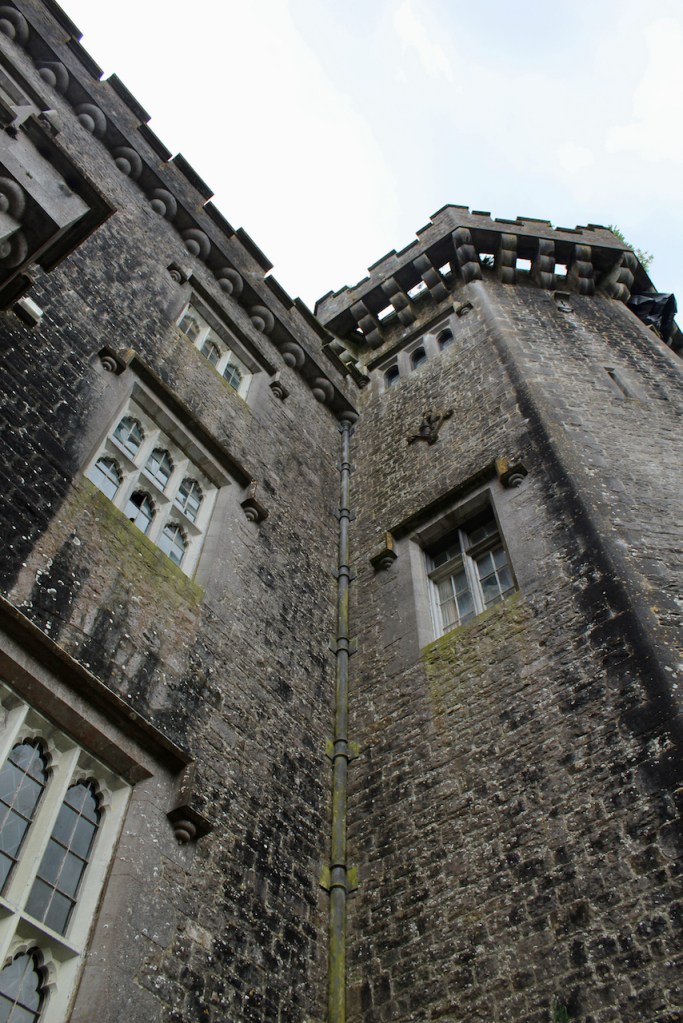 “The castle comprises a tall castellated block of snecked [snecked masonry has a mixture of roughly squared stones of different sizes] limestone rubble with ashlar trim, with a great muscular octagonal tower to the northwest and a narrow round tower with soaring tourelle [small tower] to the NE…The composition breaks out more fully in the collective irregular massing of the towers, the chapel and the stable block, which rambles off to the west.” [7]