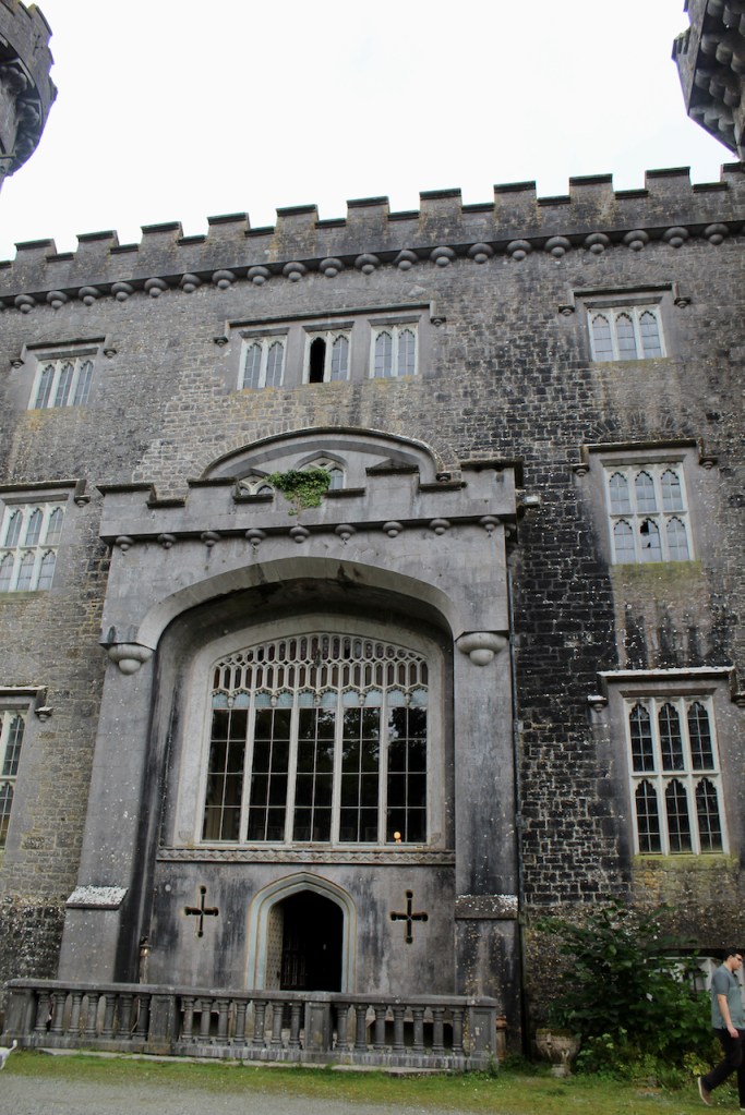 Tierney continues: “The positioning of a great window over the doorway bears comparison with the earlier group of Pale castles, such as Castle Browne (now Clongowes Woods school), attributed to Thomas Wogan Browne. It appears as a portcullis descending from a Gothic arch with a drawbridge in Lord Charleville’s original drawing (which also had a Radcliffean damsel in distress screaming from the battlements). He spent a lot of time drawing a sevenlight panelled window in its stead – the effect is much the same from afar – although the executed window is a more complex Perp design, probably by Johnston. The Tudor arch is employed three times in succession: over the door, in the recess of the great window and in the tripartite window above, which is subdivided into three further arches. This use of the same detailing at varying scales is also seen in the corbelling – a sort pair of intersecting hemispheres. The battlements are simple crenels on the main block but on the towers are rendered in a distinctly Irish fashion (a distinction Johnston would make at Tullynally and Markree), and here the corbelling is also more elaborate, sprouting upwards like cauliflower on the NE tower.“