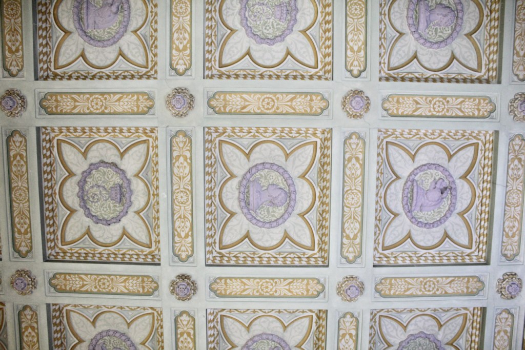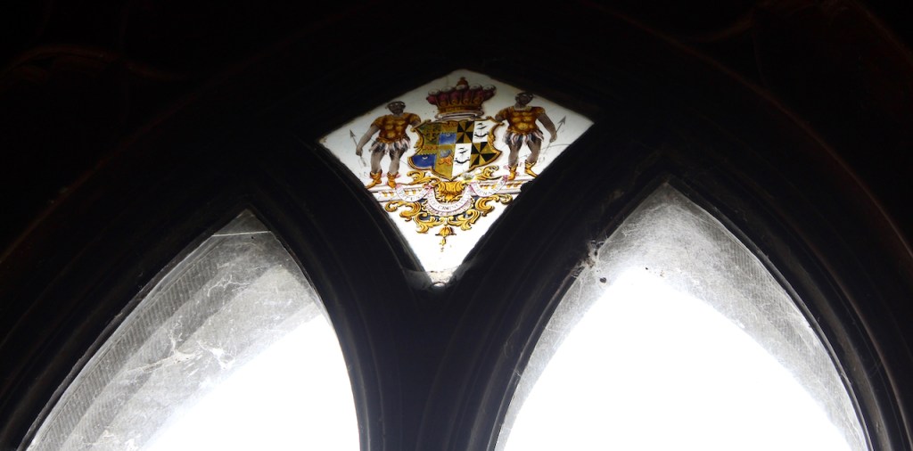 The dining room has, Tierney points out, a Dado of double-cusped panelling derived from the staircase balustrade of Strawberry Hill. The ceiling has crests of the family in the panel, supported by a Gothic frieze in the form of miniature fan vaults. The Moores are represented by a silhouette of a Moorish person, and the Burys by a boar’s head with an arrow through its neck. There are also “C”s for “Charleville.” The volunteers during Heritage Week told us that the ceiling is by William Morris, but Tierney tells us that he redecorated the room in 1875, but the scheme no longer survives. The decoration on the miniature fan vault frieze does look rather William Morris-esque to me, as well as the painting between the crests.
