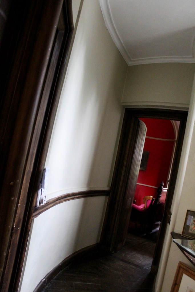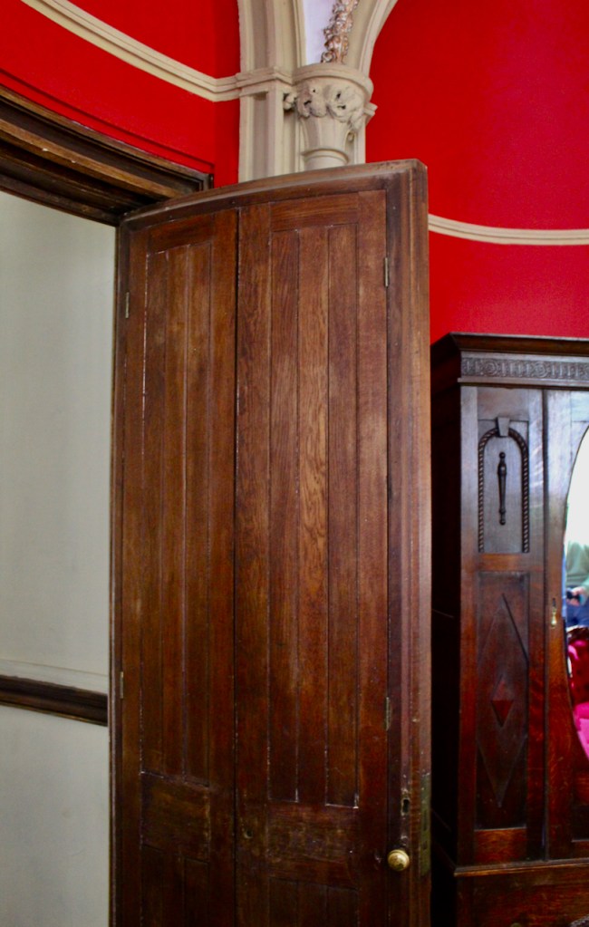 Tierney tells us that at the top of each flight, there is a great cavetto-moulded doorcase enriched with quatrefoil fretwork in plaster. The cavetto is a concave molding with a profile approximately a quarter-circle, quarter-ellipse, or similar curve. I find the staircase thrilling. Tierney writes: “Its dark colouring is in tune with the “gloomth” of its north facing aspect, and no Gothic room in Ireland rivals its Hmmer Horror atmosphere“!
